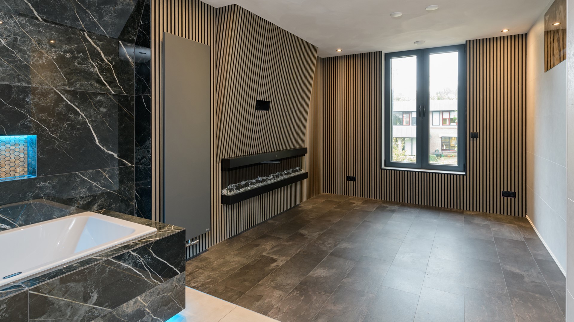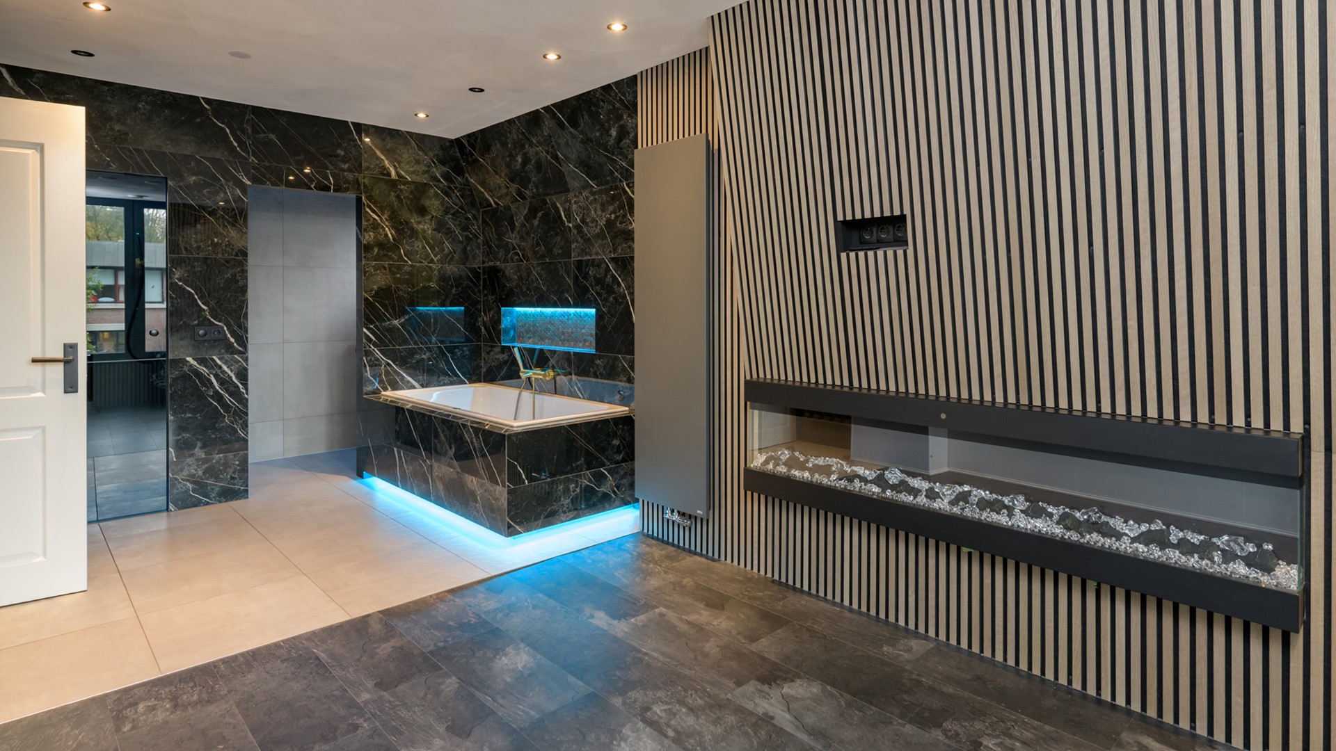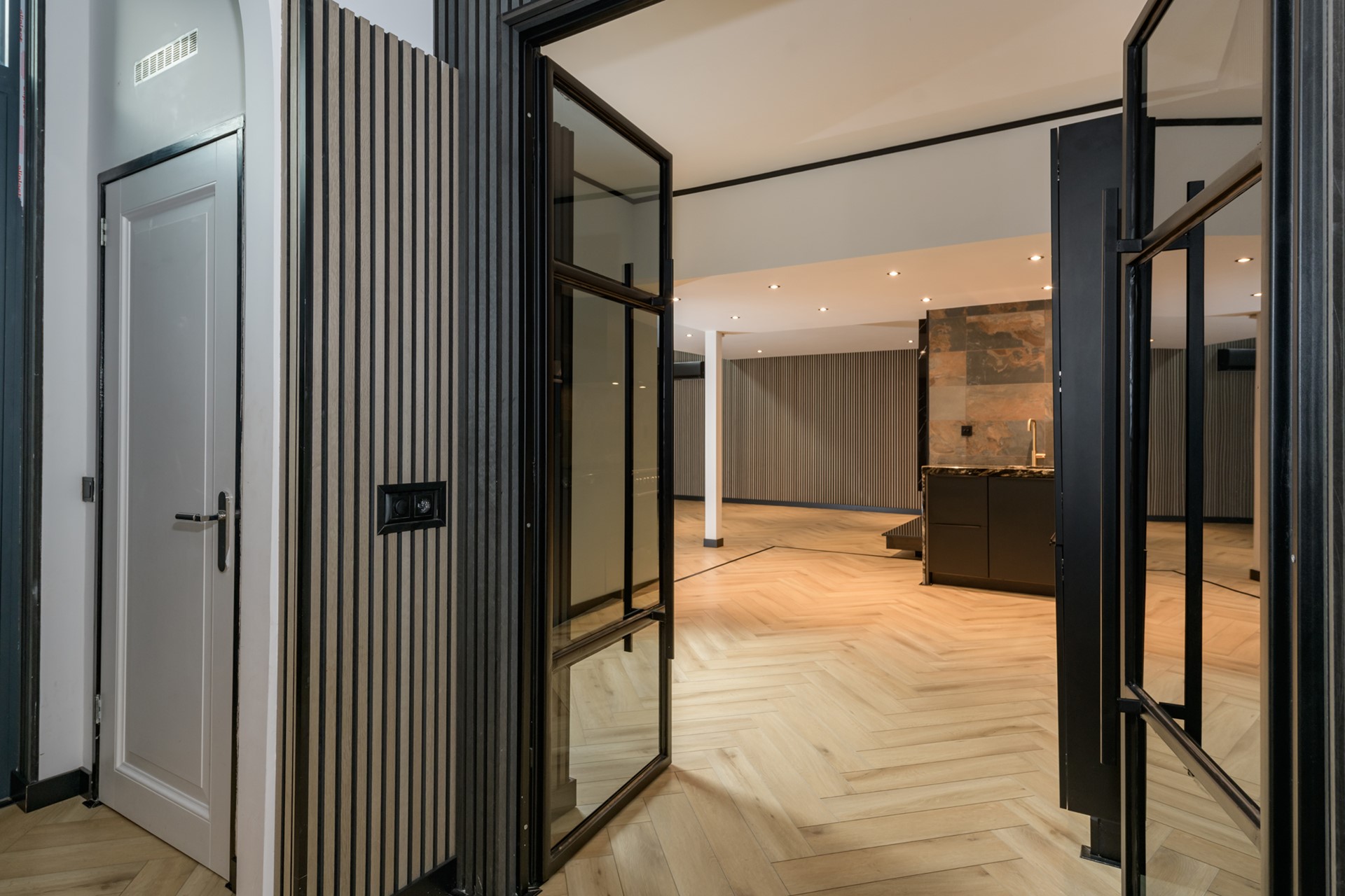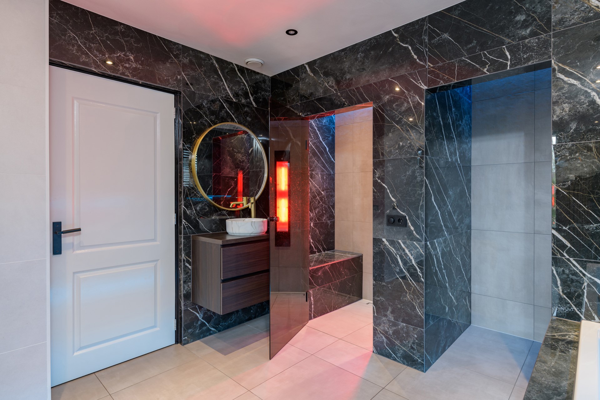 Entree/hal met garderobe, meterkast, trapkast en toilet. Middels zwarte stalen openslaande deuren is de luxe keuken te bereiken. De keuken is uitgerust met een 5-pits gaskookplaat met afzuigkap, oven, vaatwasser, combi oven en koelkast. De uitgebouwde ruime living beschikt over een in visgraat gelegde laminaatvloer, een speelse vide en een harmonica pui aan de voorzijde welke geheel opengeklapt kan worden. Doorloop naar een gang met een op maat gemaakte kastenwand waar zich tevens de aansluiting voor de was- en droogapparatuur bevindt. Daarnaast is er een ingerichte inloopkast aanwezig welke middels een schuifdeur te bereiken is. Luxe badkamer met inloopdouche, wastafelmeubel en zwevend toilet. Vanaf deze aanbouw is er tevens toegang tot de achtertuin met verwarmd zwembad en knusse overkapping met buitendouche.