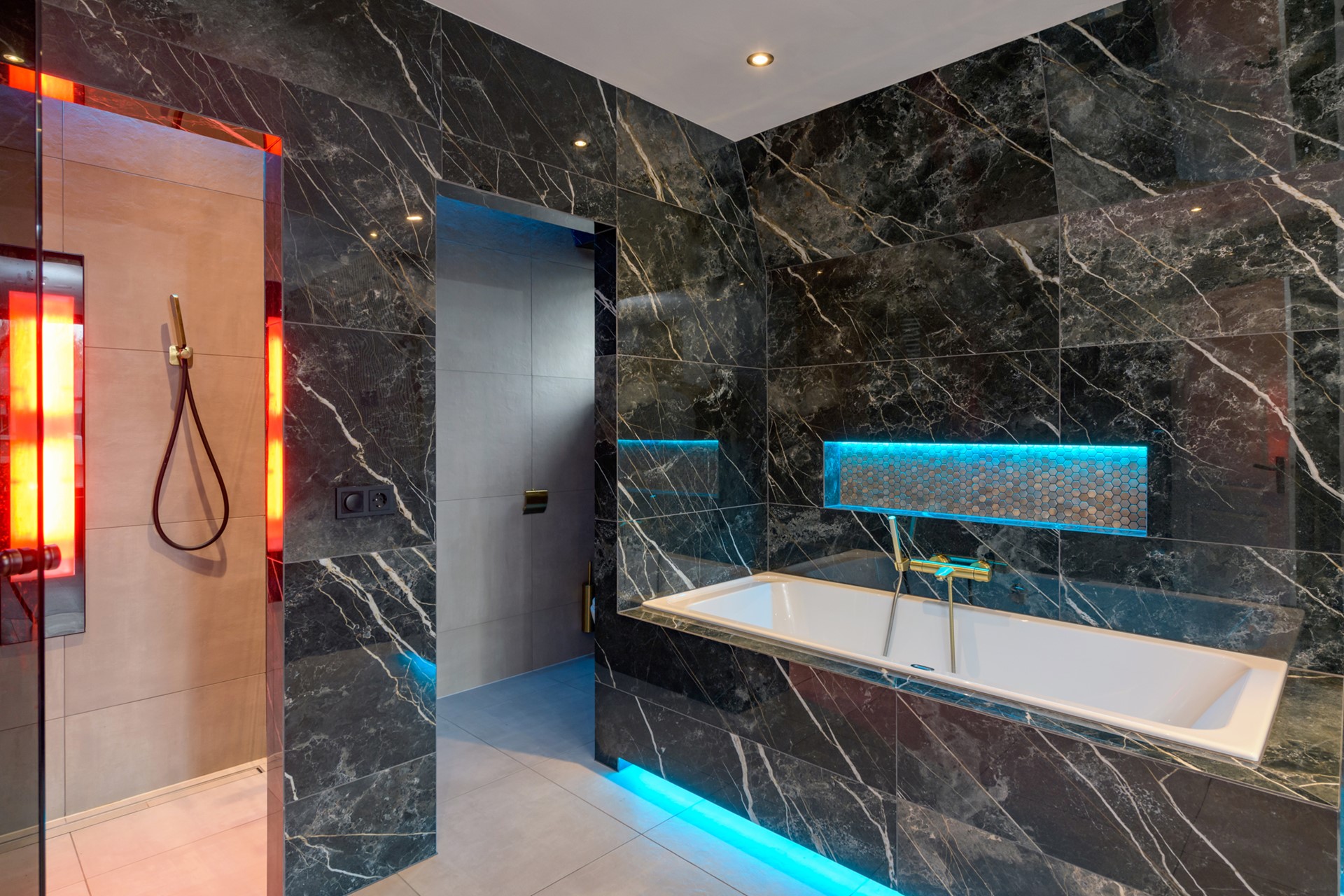 Entree/hal met garderobe, meterkast, trapkast en toilet. Middels zwarte stalen openslaande deuren is de luxe keuken te bereiken. De keuken is uitgerust met een 5-pits gaskookplaat met afzuigkap, oven, vaatwasser, combi oven en koelkast. De uitgebouwde ruime living beschikt over een in visgraat gelegde laminaatvloer, een speelse vide en een harmonica pui aan de voorzijde welke geheel opengeklapt kan worden. Doorloop naar een gang met een op maat gemaakte kastenwand waar zich tevens de aansluiting voor de was- en droogapparatuur bevindt. Daarnaast is er een ingerichte inloopkast aanwezig welke middels een schuifdeur te bereiken is. Luxe badkamer met inloopdouche, wastafelmeubel en zwevend toilet. Vanaf deze aanbouw is er tevens toegang tot de achtertuin met verwarmd zwembad en knusse overkapping met buitendouche.