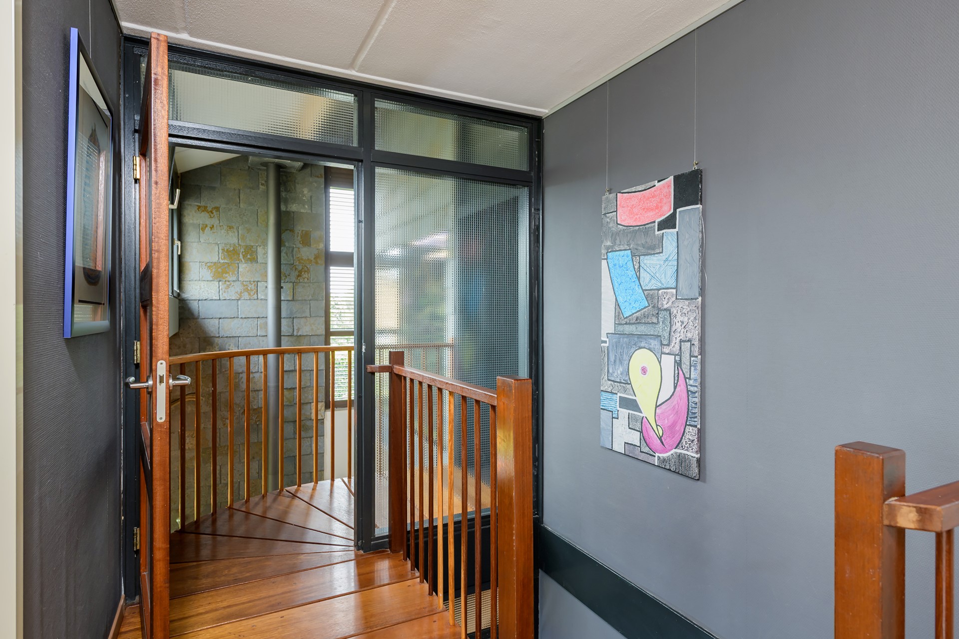 Overloop, vier slaapkamers en een badkamer. Drie slaapkamers zijn vanaf de overloop te bereiken en de grootste slaapkamer via de vide in de woonkamer. De hoofdslaapkamer geeft toegang tot het balkon met kunststof vlonders. Eén van de drie overige slaapkamers heeft een vaste trap naar een vide. De luxe badkamer beschikt over een duo inloopdouche, zwevend toilet, dubbel wastafelmeubel en een red cedar sauna.