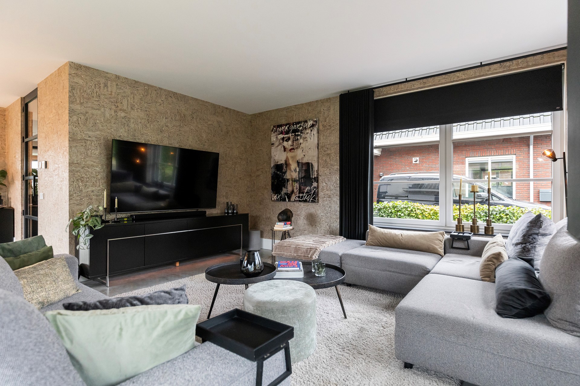 Entree/hal, toilet met fonteintje en uitgebreide meterkast. Aan de voorzijde van de woning bevindt zich de ruime living met grote raampartijen en een sfeervolle open haard. In het hart van de woning bevindt zich de eethoek, die de woonkamer en keuken met elkaar verbindt. Middels openslaande deuren is het aangrenzende terras te bereiken. De tuingerichte woonkeuken is de ideale plek voor culinaire creativiteit en gezellige momenten. De luxe keuken beschikt over een kook-/spoeleiland en is zeer compleet uitgevoerd met alle denkbare inbouwapparatuur zoals inductiekookplaat met een “Falmec” afzuigkap, stoomoven, vaatwasser, koffiemachine en een wijnklimaatkast. De Amerikaanse koelvriescombinatie staat los, maar behoort bij de keuken en blijft achter. Vanuit de keuken zijn dubbele openslaande deuren aanwezig die leiden naar de aangrenzende tuinkamer. De sfeervolle buitenhaard en de glazen schuifwanden maken het mogelijk om het hele jaar door te genieten van het buitenleven. Deze overdekte ruimte is een perfecte verlenging van de woonkeuken en biedt een heerlijke plek voor ontspanning of een avond borrelen met vrienden. Tevens is vanuit de keuken de aangebouwde, geïsoleerde garage te bereiken. In de garage staat de warmtepomp opgesteld en is een ruime inbouwkast aanwezig. Op de gehele begane grond ligt een monoliet betonvloer, met vloerverwarming.
