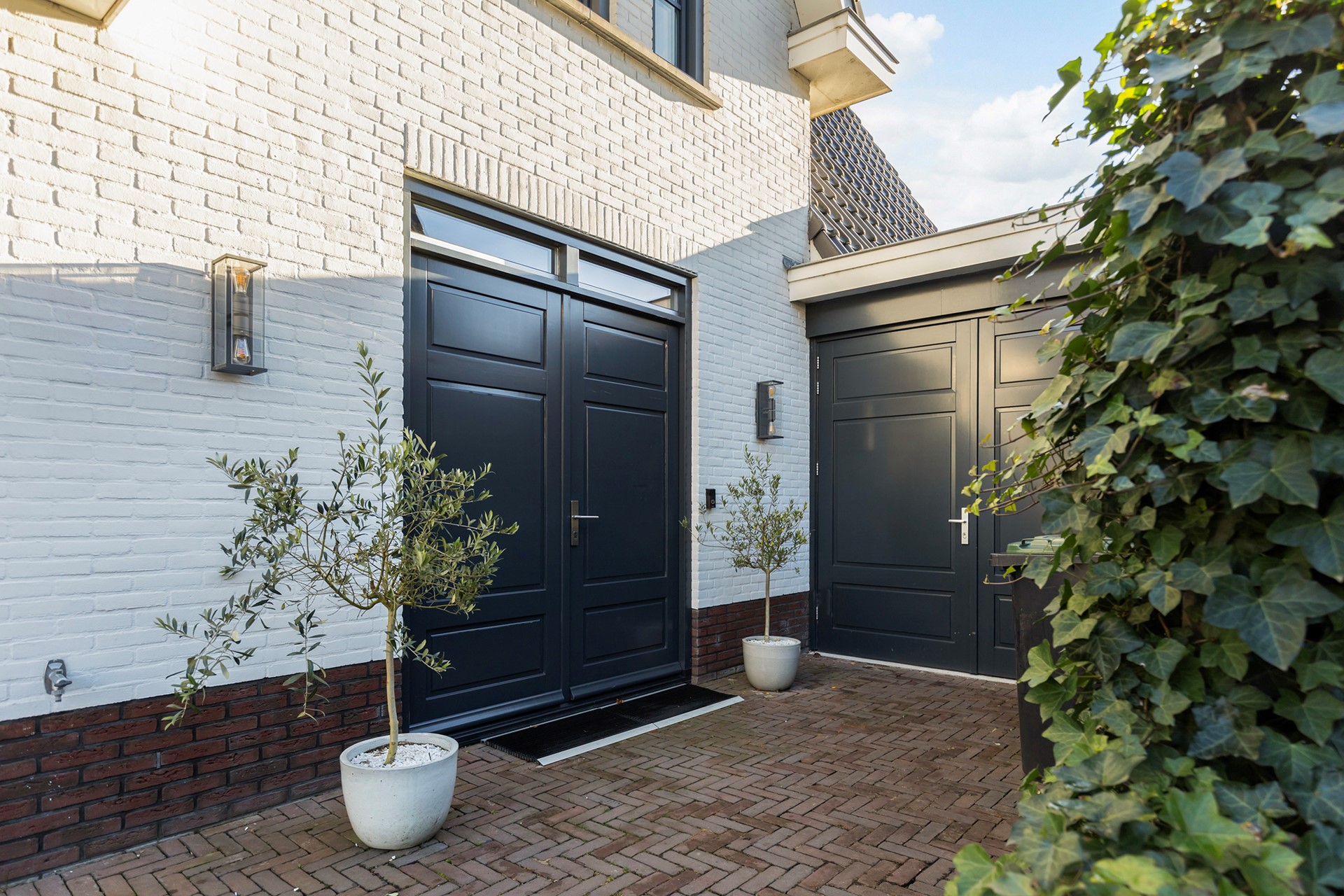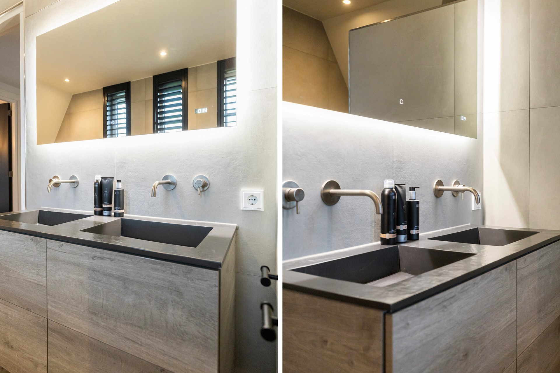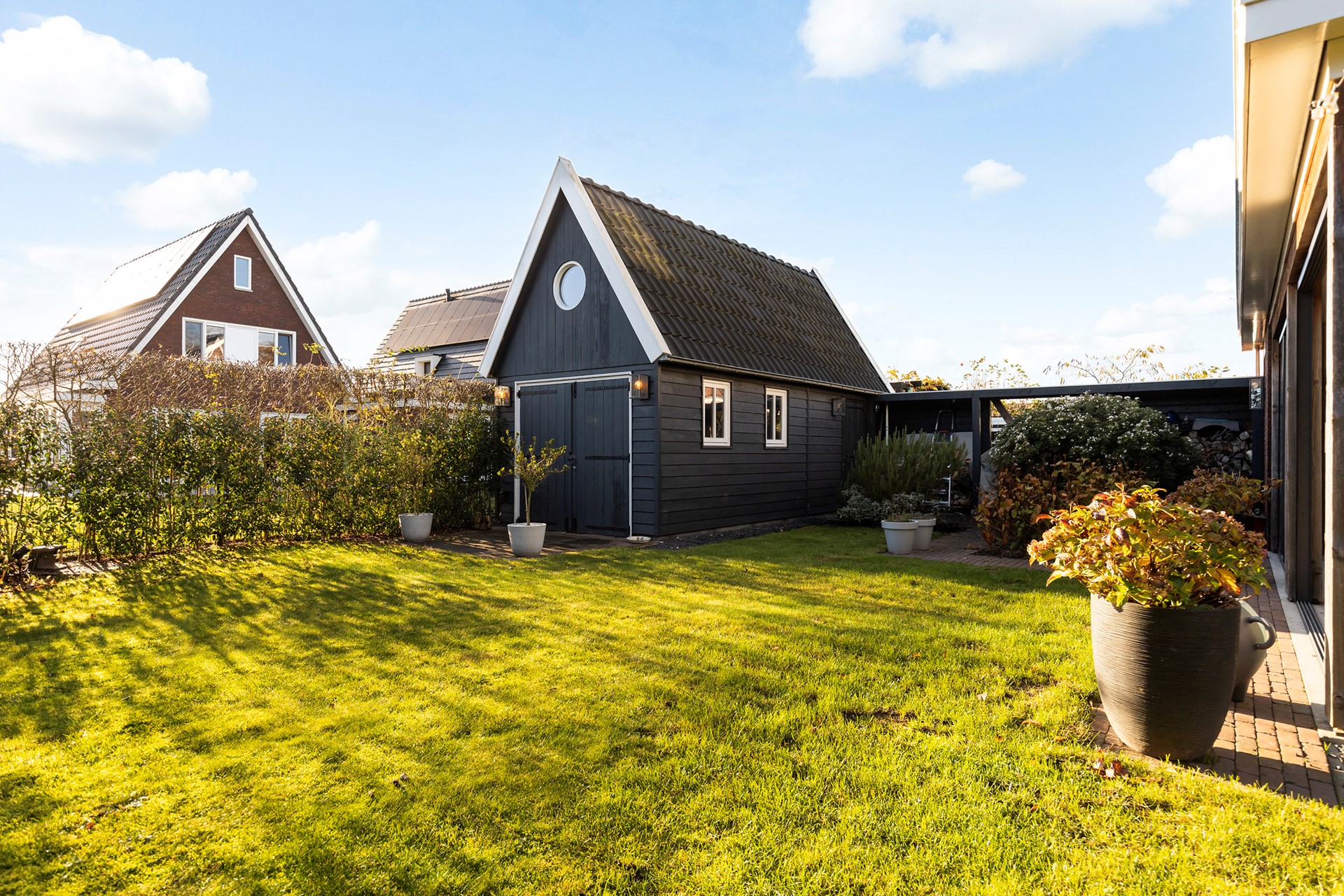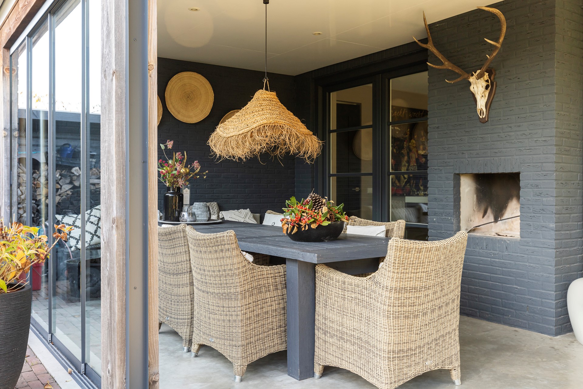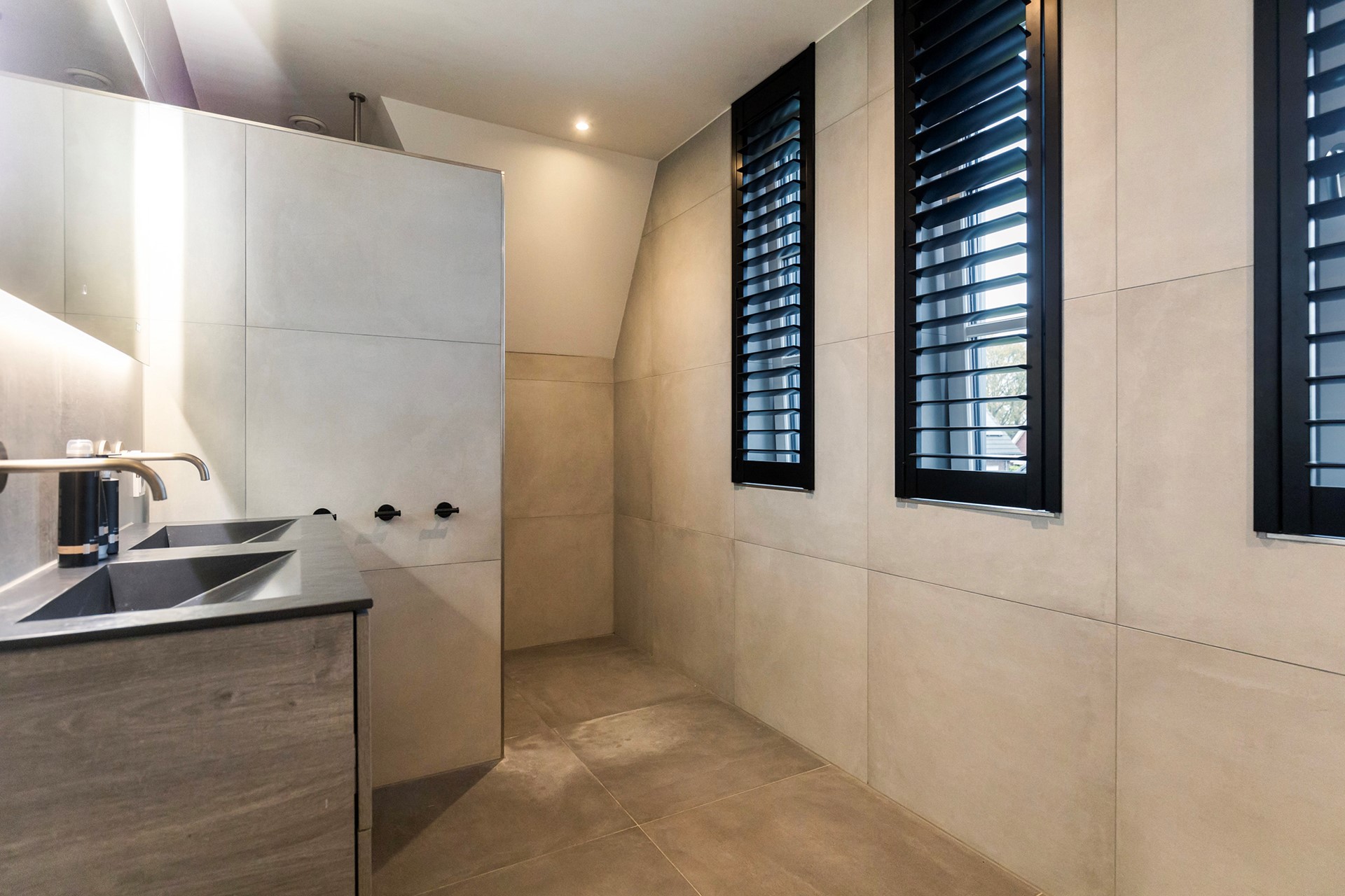 Entree/hal, toilet met fonteintje en uitgebreide meterkast. Aan de voorzijde van de woning bevindt zich de ruime living met grote raampartijen en een sfeervolle open haard. In het hart van de woning bevindt zich de eethoek, die de woonkamer en keuken met elkaar verbindt. Middels openslaande deuren is het aangrenzende terras te bereiken. De tuingerichte woonkeuken is de ideale plek voor culinaire creativiteit en gezellige momenten. De luxe keuken beschikt over een kook-/spoeleiland en is zeer compleet uitgevoerd met alle denkbare inbouwapparatuur zoals inductiekookplaat met een “Falmec” afzuigkap, stoomoven, vaatwasser, koffiemachine en een wijnklimaatkast. De Amerikaanse koelvriescombinatie staat los, maar behoort bij de keuken en blijft achter. Vanuit de keuken zijn dubbele openslaande deuren aanwezig die leiden naar de aangrenzende tuinkamer. De sfeervolle buitenhaard en de glazen schuifwanden maken het mogelijk om het hele jaar door te genieten van het buitenleven. Deze overdekte ruimte is een perfecte verlenging van de woonkeuken en biedt een heerlijke plek voor ontspanning of een avond borrelen met vrienden. Tevens is vanuit de keuken de aangebouwde, geïsoleerde garage te bereiken. In de garage staat de warmtepomp opgesteld en is een ruime inbouwkast aanwezig. Op de gehele begane grond ligt een monoliet betonvloer, met vloerverwarming.