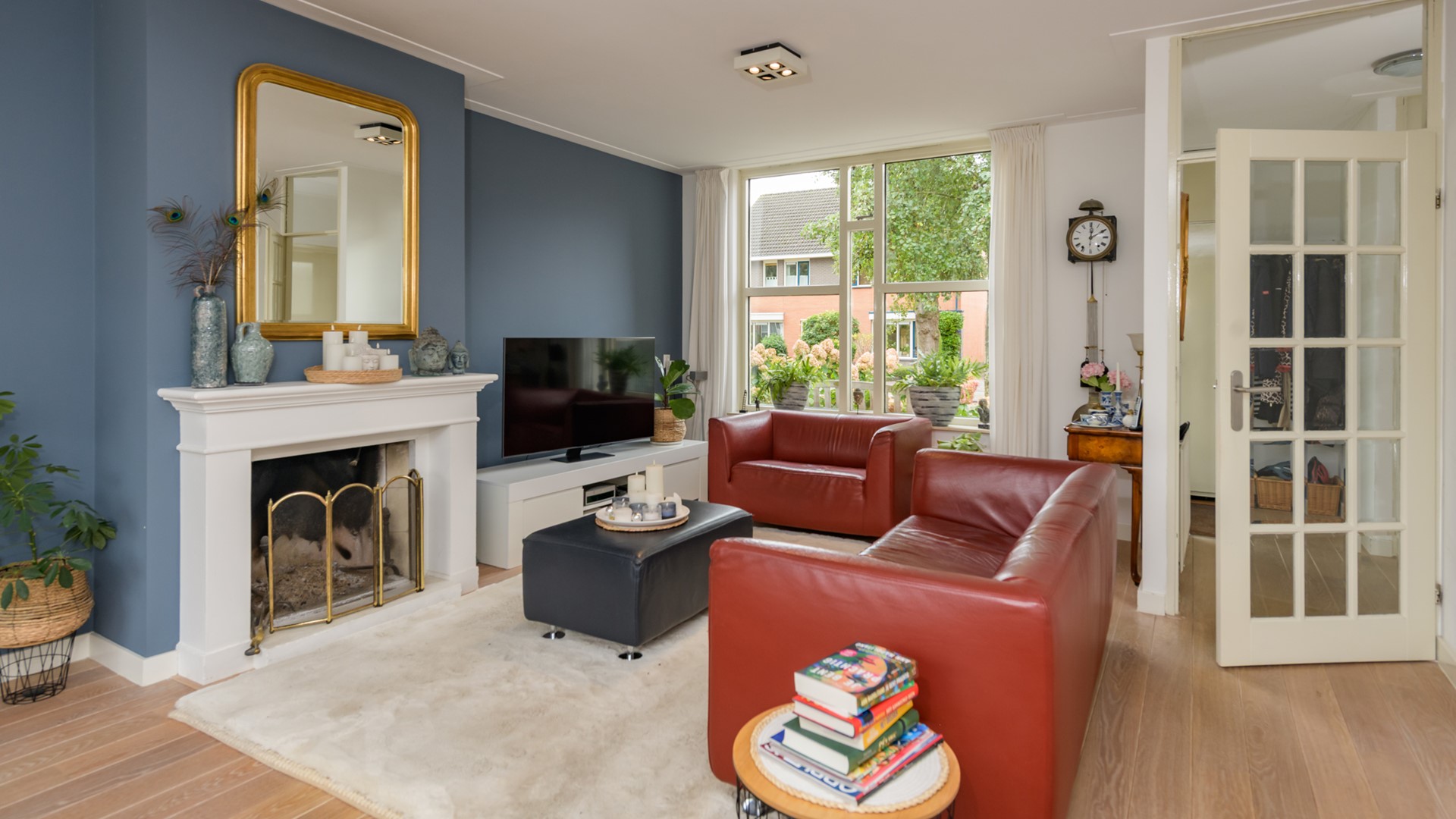 De lichte woonkamer is voorzien van een sfeervolle schouw met open haard en een praktische trapkast. De keuken, geplaatst in een hoekopstelling, heeft vernieuwde frontjes en is uitgerust met diverse inbouwapparatuur van Miele en Bosch: een 4-pits inductiekookplaat met afzuigkap, een combi-oven, koel-/vriescombinatie en een vaatwasser. Vanuit de keuken is er toegang tot de leuk aangelegde tuin met achterom met rechtstreekse doorloop naar het speelveldje.