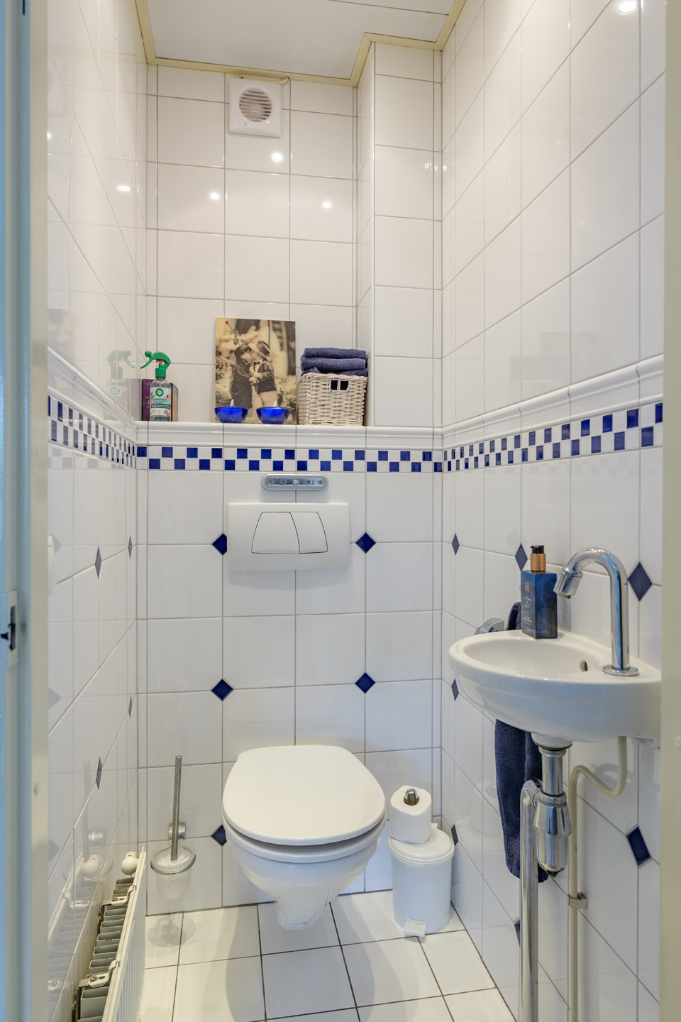 Entree/hal met meterkast, modern zwevend toilet en toegang tot de garage. In de garage bevinden zich de aansluitingen voor was- en droogapparatuur.