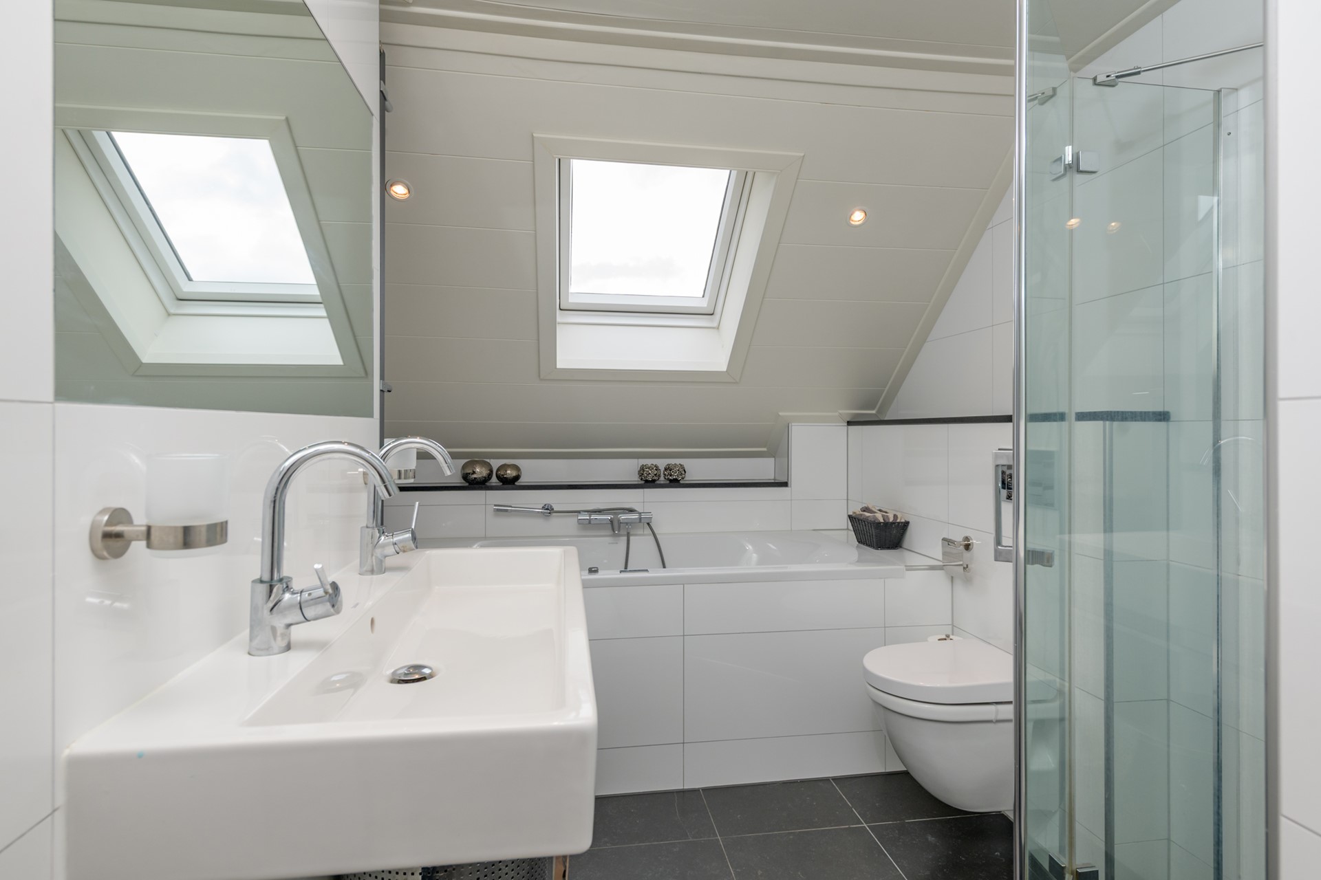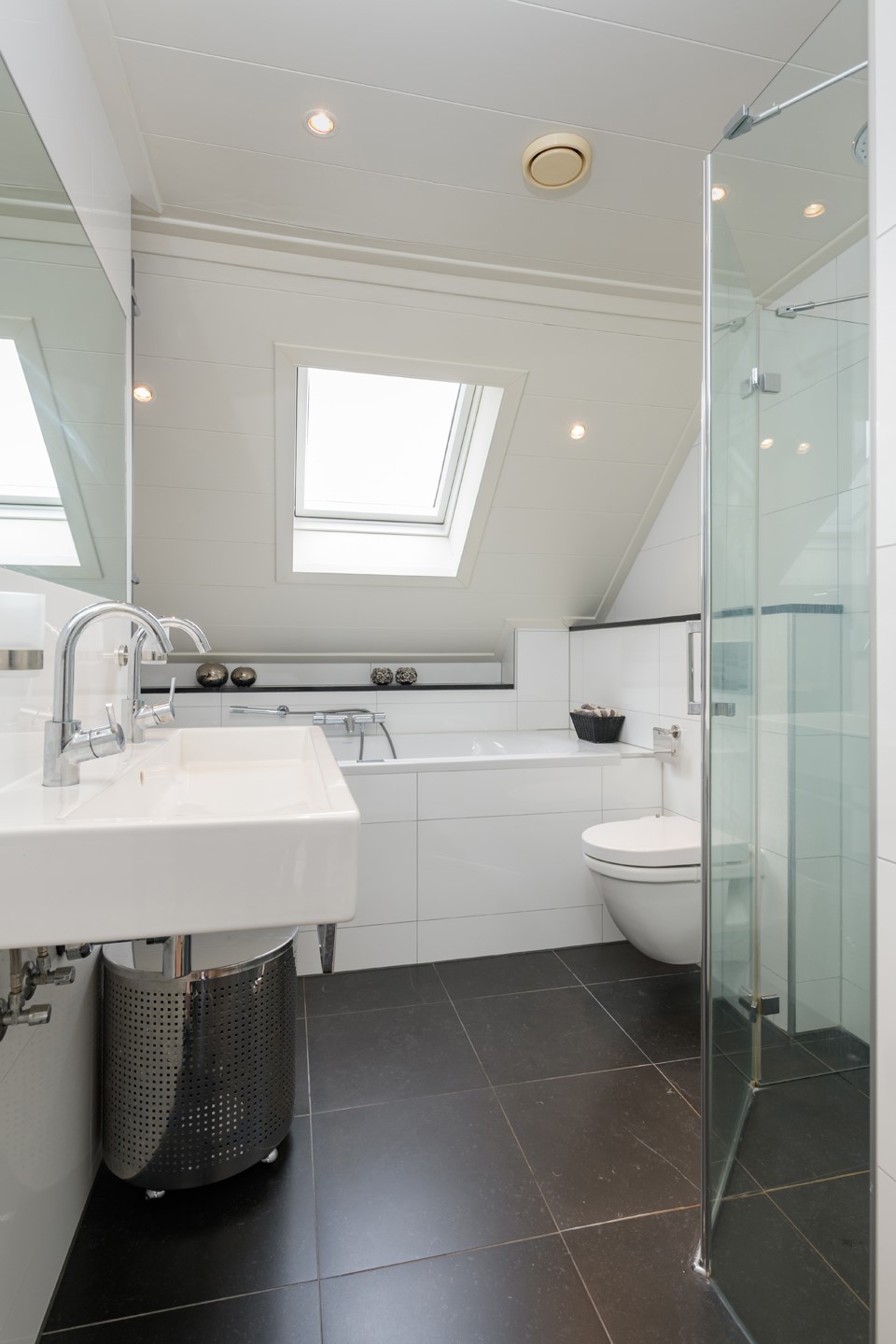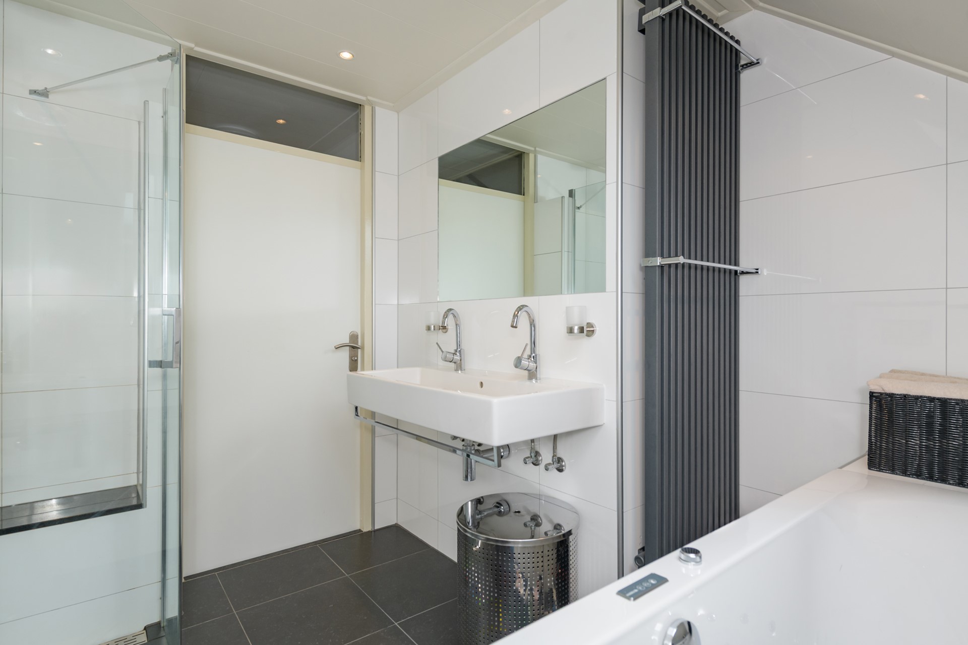Overloop en twee ruime slaapkamers (oorspronkelijk drie). De moderne badkamer is compleet uitgevoerd en voorzien van whirlpool ligbad, inloopdouche, dubbele wastafel en een toilet.