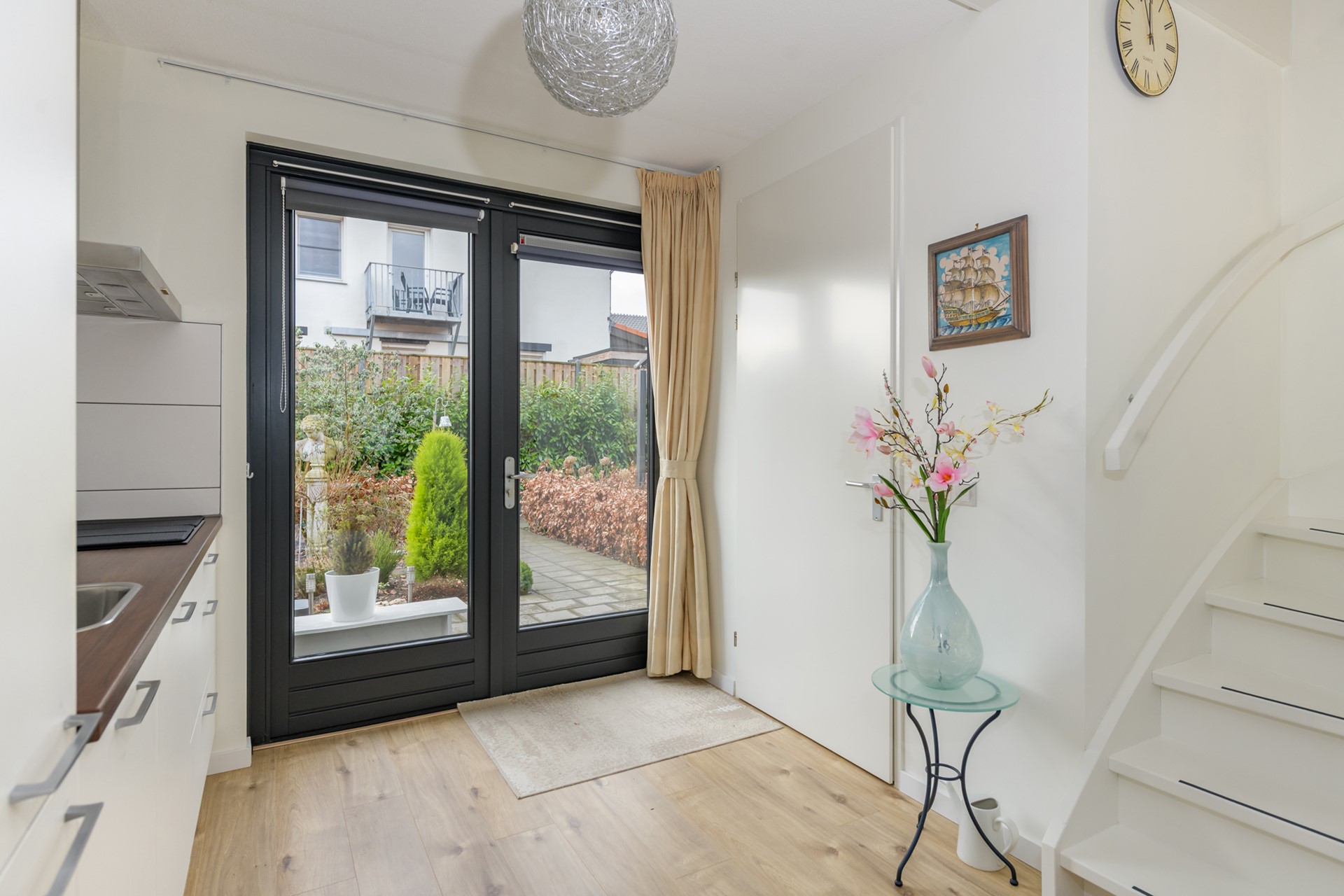 Entree/hal met meterkast. Binnenkomst in de keuken welke verbinding heeft met de voortuin middels openslaande deuren. De moderne keuken is uitgerust met een 4-pits inductiekookplaat met afzuigkap en een koelvriescombinatie. Er is een praktische trapkast aanwezig voor extra bergruimte en een hal met toegang tot het toilet met fonteintje. De knusse woonkamer geeft toegang tot de tuin. In de geïsoleerde houten berging staat de warmtepomp opgesteld.