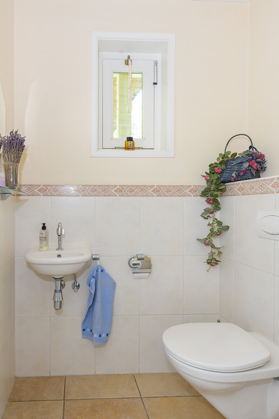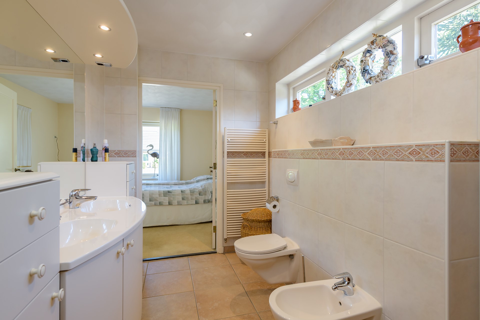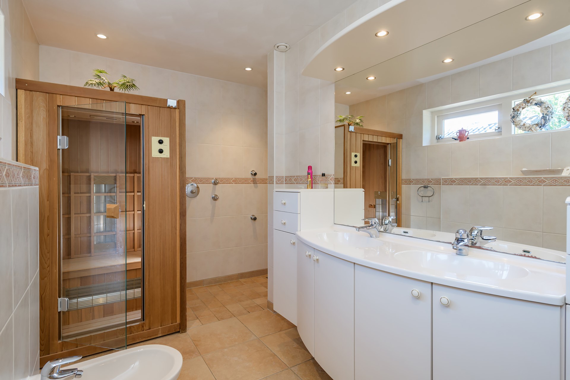 De hoofdslaapkamer is een fijne ruimte met een eigen badkamer en een inloopkast. De badkamer is zeer compleet uitgevoerd met een inloopdouche, infraroodsauna, dubbel wastafelmeubel, toilet en een bidet.