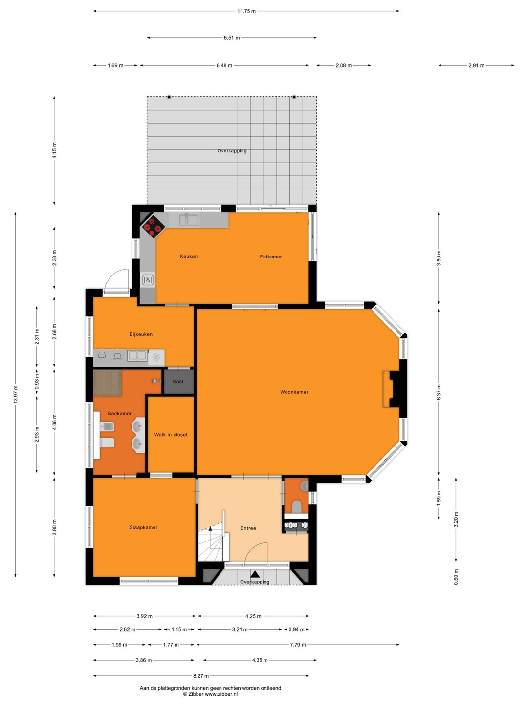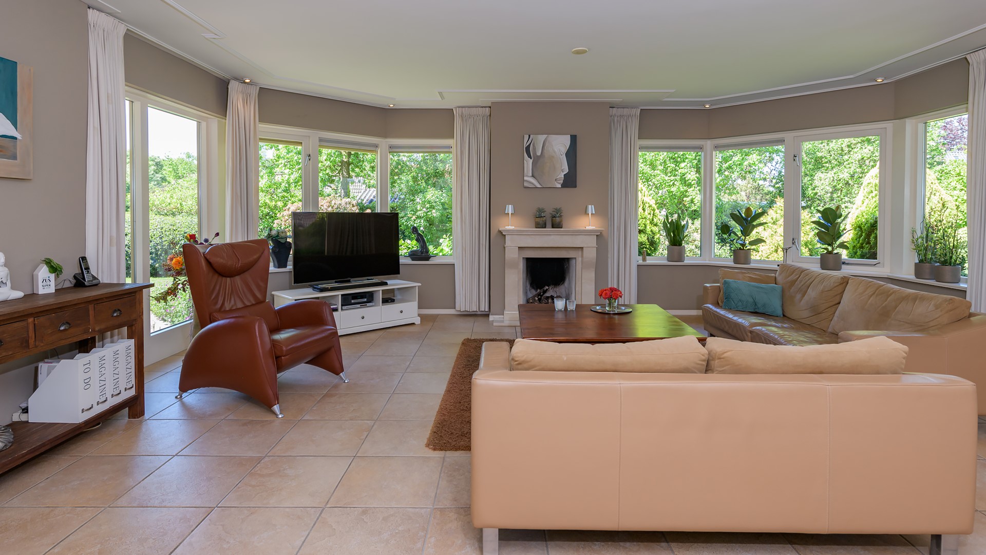 Binnenkomst in de riante hal met garderobe, toilet met fonteintje en de meterkast. Vanaf de hal is zowel de woonkamer als de slaapkamer te bereiken. De woonkamer is ruim (kleine 50 m2) en speels door de ronde vorm aan de tuinzijde. Tevens bevindt zich hier de schouw met open haard. Genoeg ingrediënten om een fijne living te realiseren met meerdere zithoeken en eventueel een eethoek. Middels en suite deuren is de tuingerichte woonkeuken te bereiken. Hier zijn twee schuifpuien aanwezig wat zorgt voor verbinding met het aangrenzende terras. De keuken is geplaatst in een hoekopstelling en beschikt over diverse inbouwapparatuur waaronder een 4-pits inductiekookplaat met afzuigkap, combi oven, koelkast, vaatwasser en een quooker. Aangrenzend aan de keuken bevindt zich de bijkeuken met een vaste kast en de aansluiting voor de was- en droogapparatuur.