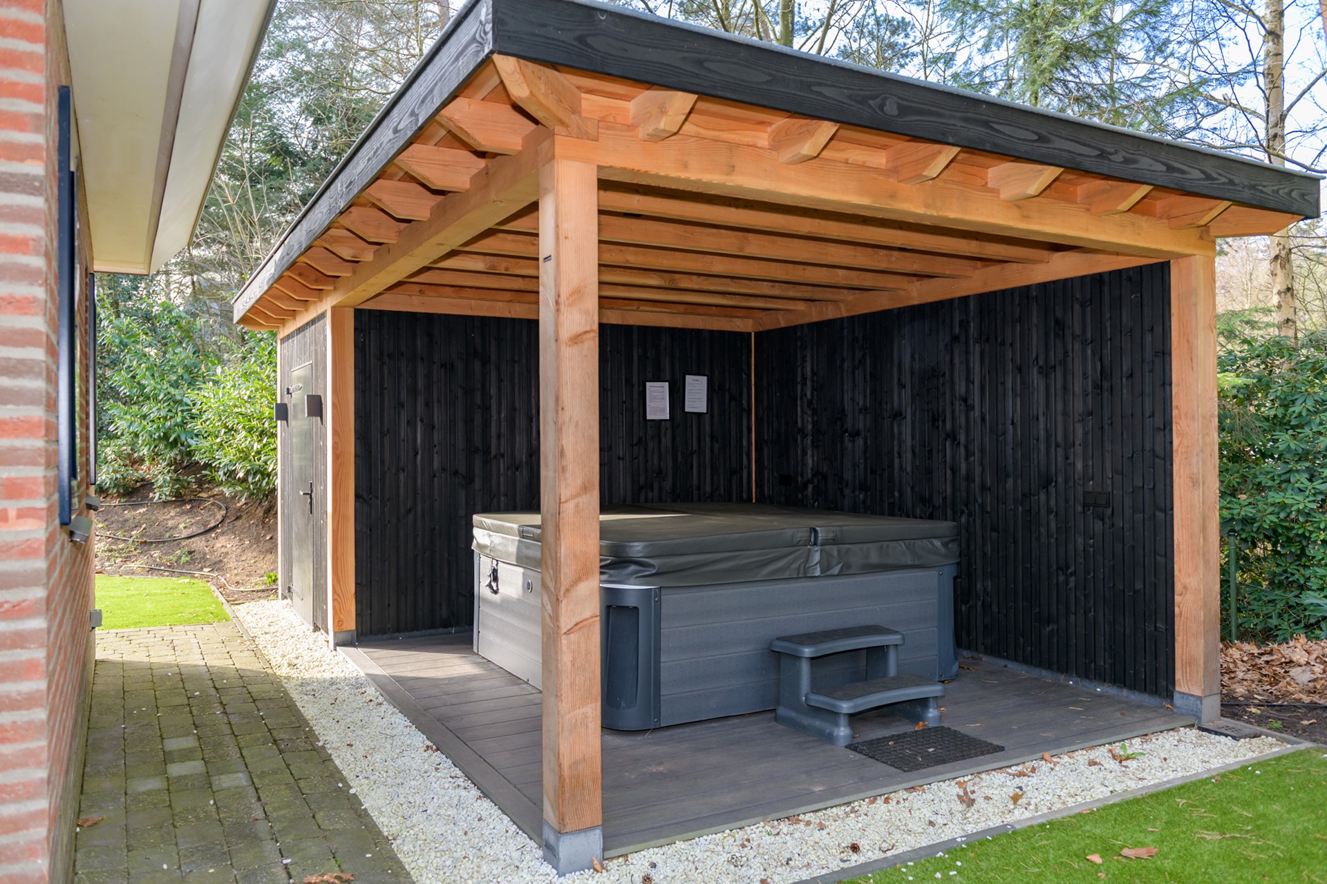 - Op het perceel staat een vrijstaande houten berging met overkapping en jacuzzi;