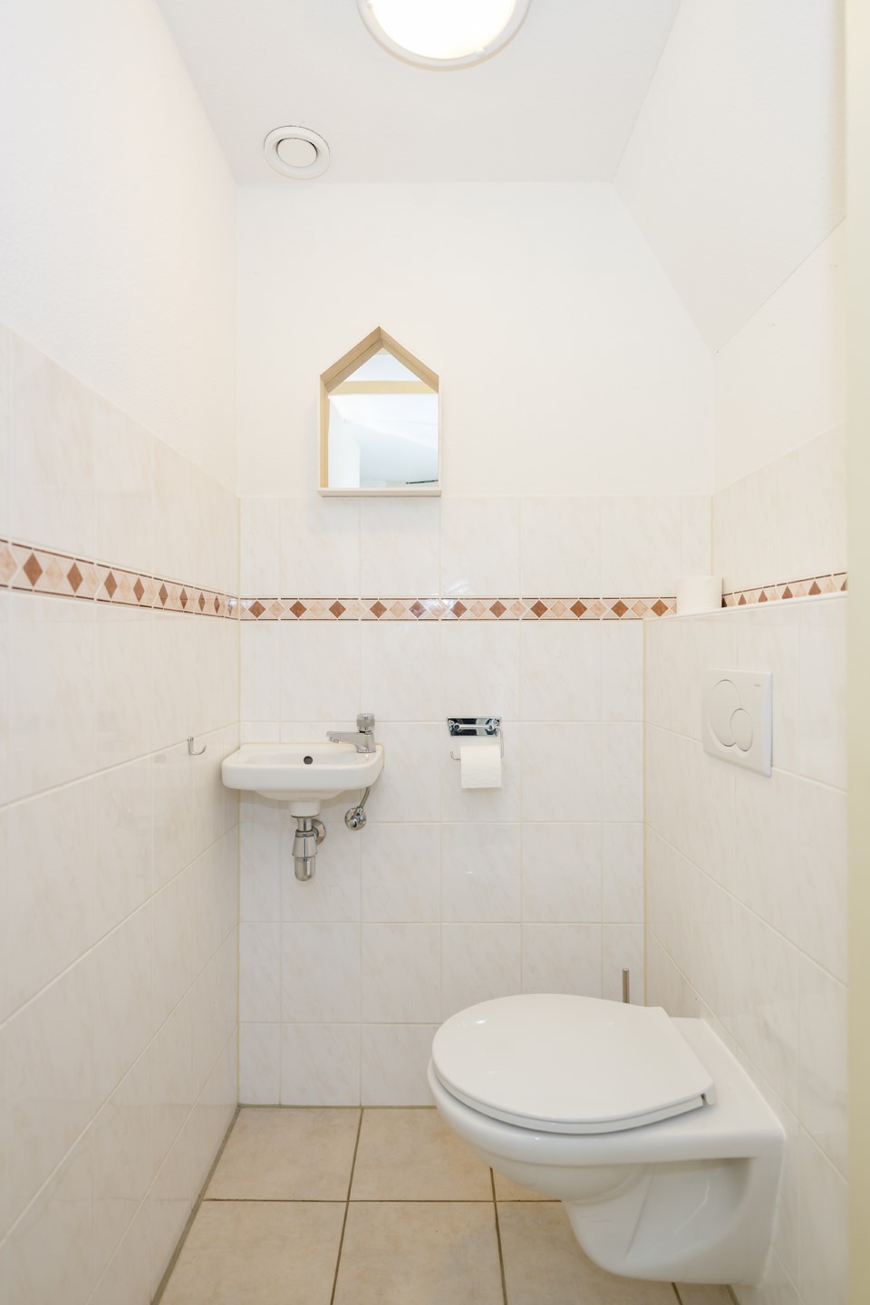 De nette open keuken is voorzien van diverse inbouwapparatuur, waaronder een 5-pits gaskookplaat met afzuigkap, combi-oven, vaatwasser en koel-vriescombinatie. Aansluitend bevindt zich de bijkeuken/berging met achteringang, waar de wasmachine en droger opgesteld staan. Verder beschikt de begane grond over een ruime slaapkamer met inbouwkast en een moderne, complete badkamer met douchecabine, ligbad en wastafelmeubel.