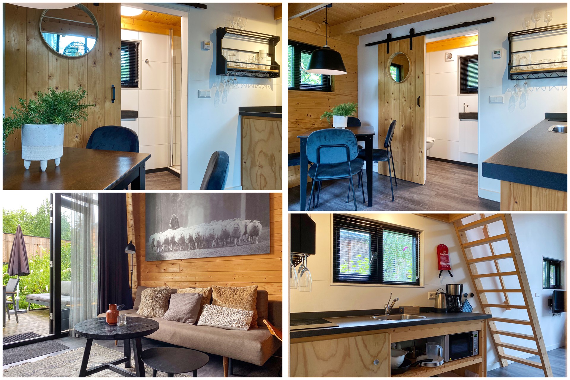 Binnenkomst in de lichte woonkamer door de grote raampartij, met pelletkachel, open keuken met 2-pits inductiekookplaat en koelkast. Moderne badkamer met inloopdouche, wastafel en zwevend toilet. Vaste kast met boiler en groepenkast. Vaste trap naar de twee persoons slaapkamer met lichtkoepel.