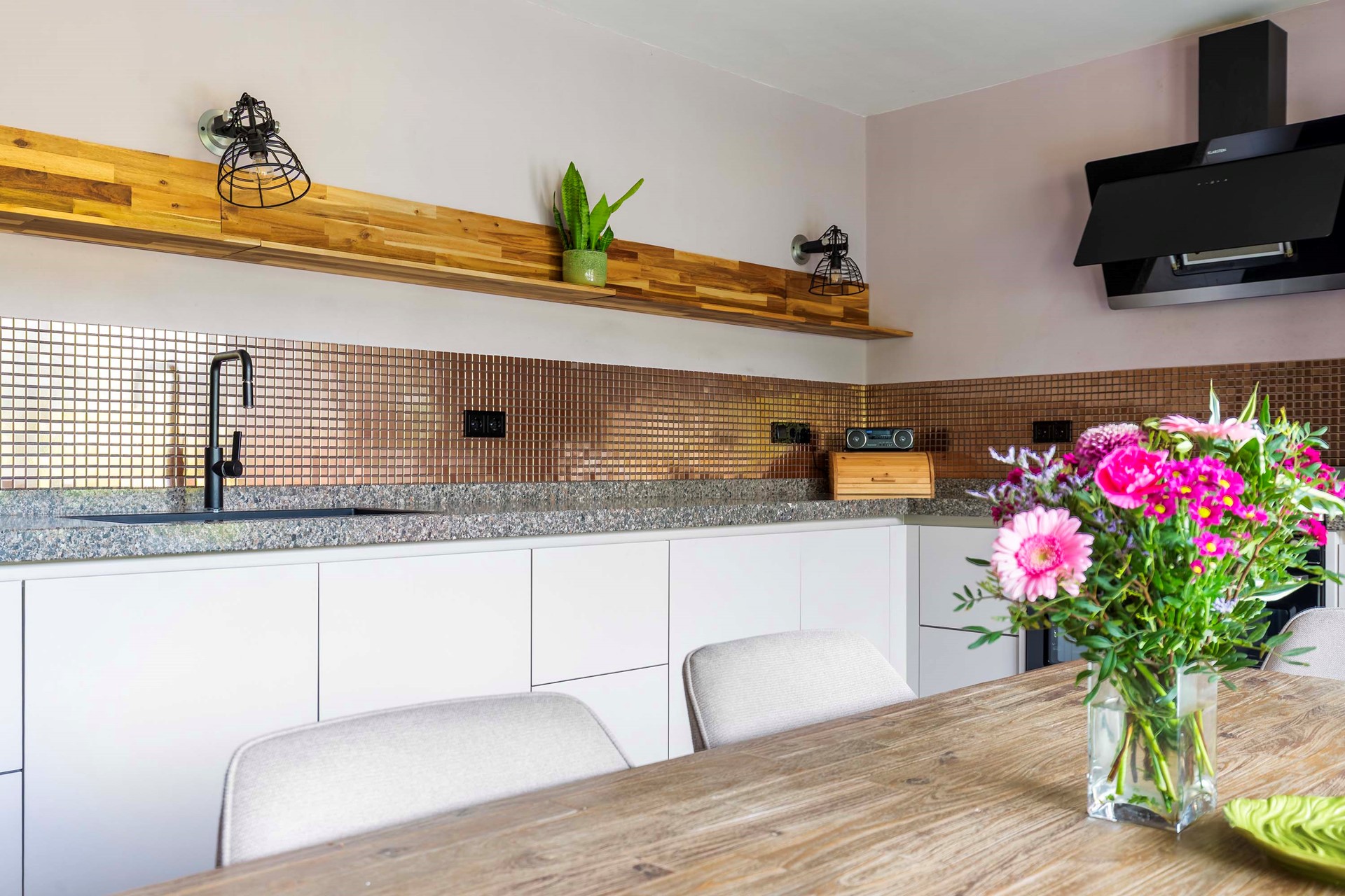 Centraal op de begane grond ligt de luxe woonkeuken – een absolute eyecatcher. Via een zwart metaal geframede deur komt u in deze royale, lichte leefkeuken met openslaande deuren naar het zonnige terras aan de voorzijde. Er is volop plek voor een grote eettafel, ideaal voor lange diners met goed gezelschap. De moderne keuken (hoekopstelling) is uitgerust met een 5-pits “Boretti”gasfornuis met dubbele oven en afzuigkap, een koffiemachine en vaatwasser.