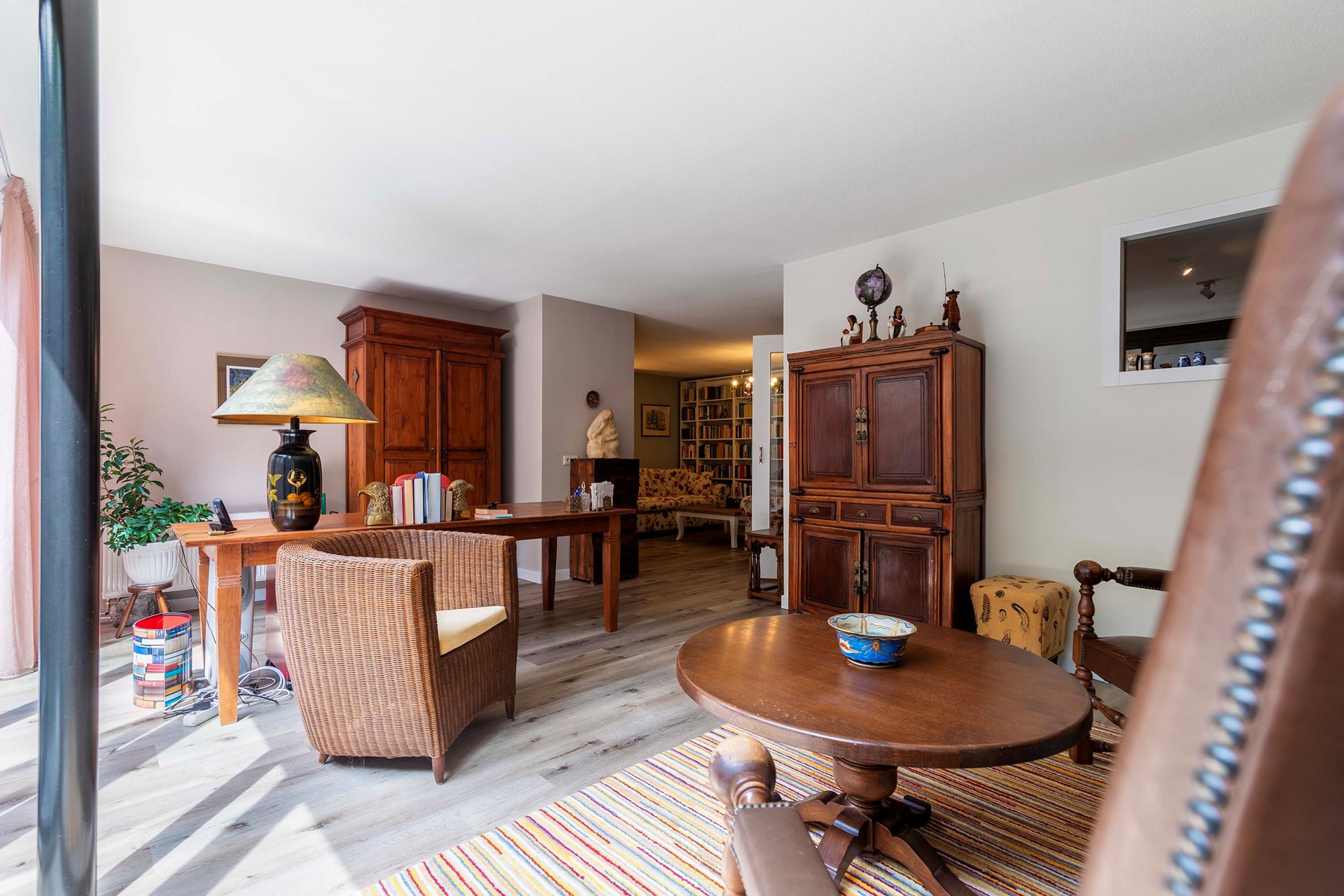 De woonkamer aan de achterzijde is bereikbaar via en-suitedeuren met rookglas en biedt eveneens veel licht en ruimte. Grote raampartijen, een stijlvolle gashaard, openslaande tuindeuren en een extra achteringang verbinden binnen en buiten moeiteloos. De antracietgrijze tegelvloer geeft de ruimte een moderne, rustige uitstraling. Aangrenzend bevindt zich een royale werkkamer met eveneens toegang tot de tuin. Het is tevens mogelijk om hier een slaap- en badkamer te realiseren, waardoor gelijkvloers wonen tot de mogelijkheden behoort.
