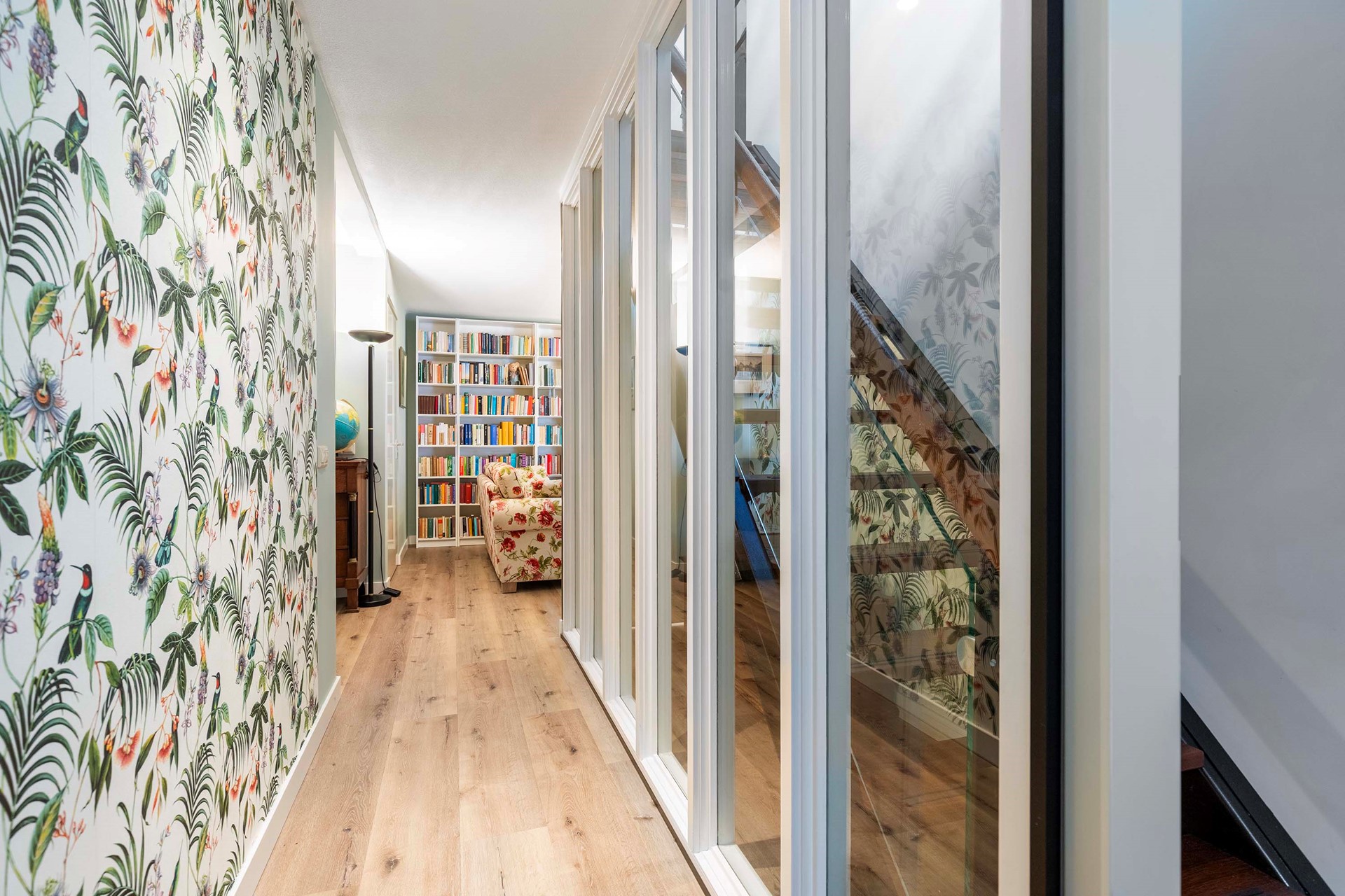Op de eerste verdieping bevindt zich een ruime overloop, drie slaapkamers en een luxe badkamer. De royale ouderslaapkamer heeft een heerlijke sfeer door de grote raampartijen en directe toegang tot een loggia met uitzicht over de tuin. Eén van de andere slaapkamers is voorzien van een Frans balkon.