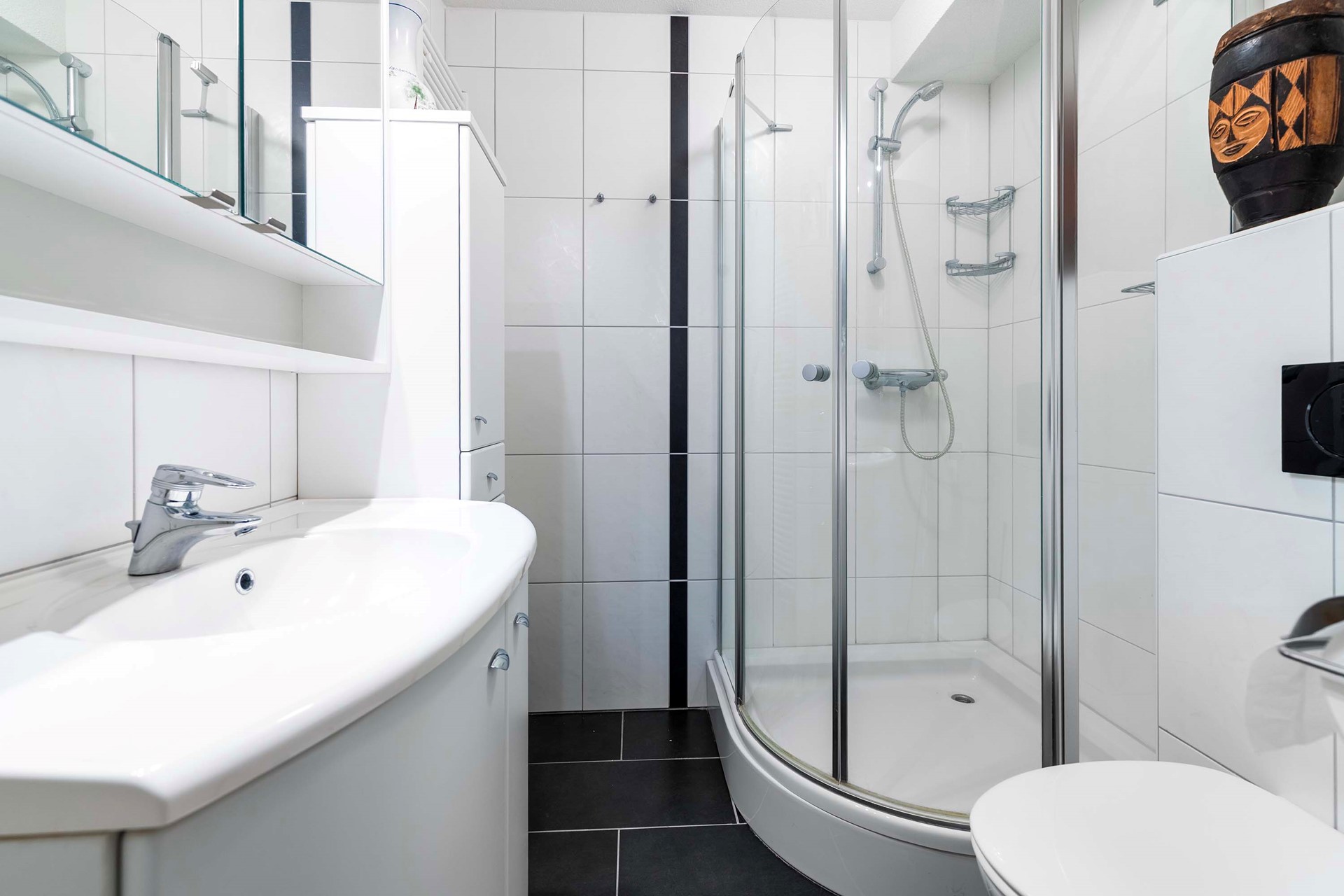 De badkamer is uitgerust met een douchecabine, toilet en wastafelmeubel. In de technische ruimte vindt u een tweede aansluiting voor was- en droogapparatuur, een spoelbak, de zonneboiler (Agpo) en de CV-ketel (Ferroli, 2017).