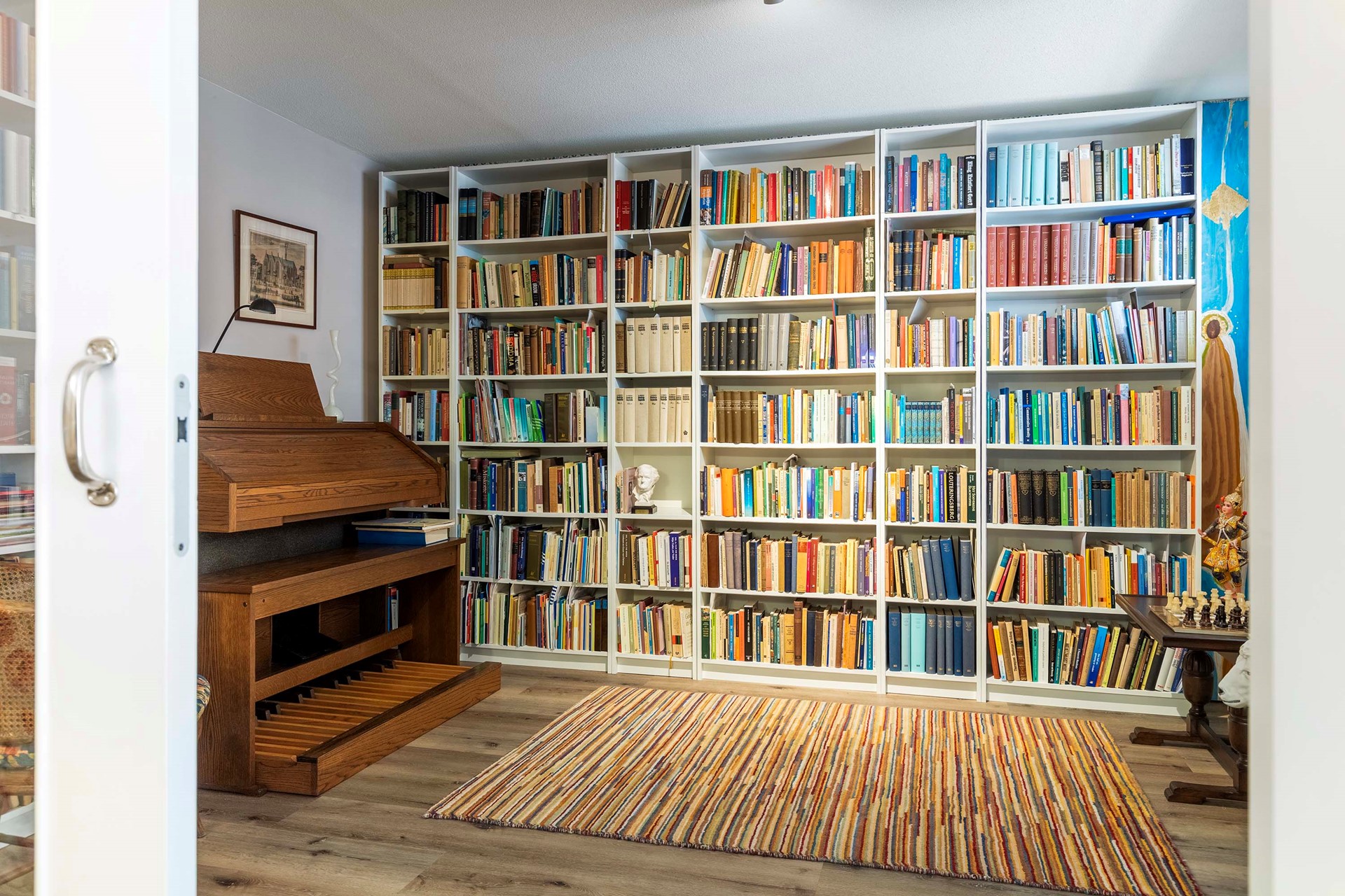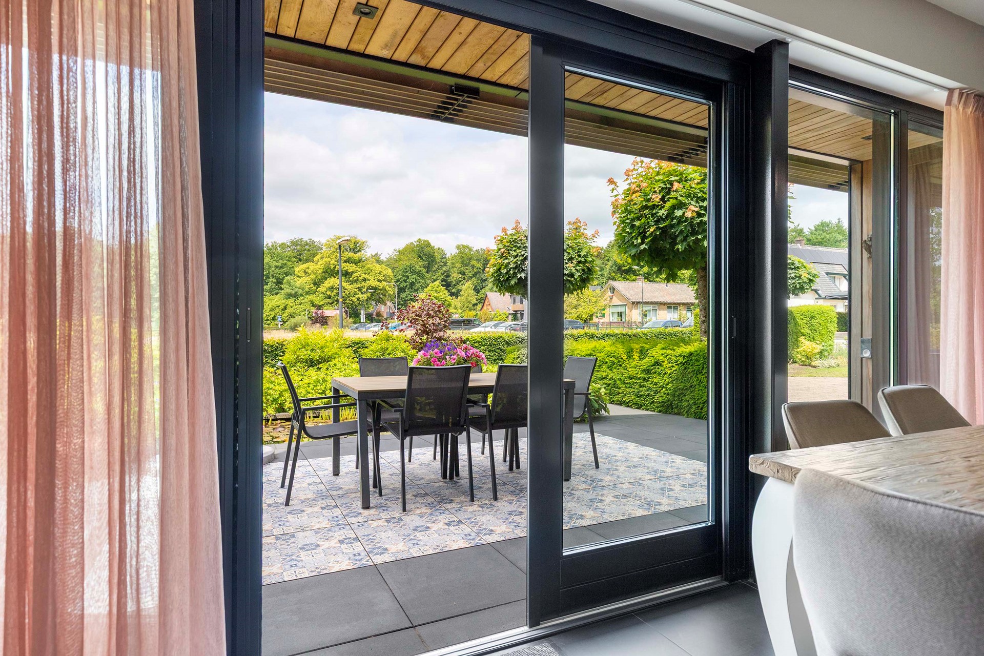 De woonkamer aan de achterzijde is bereikbaar via en-suitedeuren met rookglas en biedt eveneens veel licht en ruimte. Grote raampartijen, een stijlvolle gashaard, openslaande tuindeuren en een extra achteringang verbinden binnen en buiten moeiteloos. De antracietgrijze tegelvloer geeft de ruimte een moderne, rustige uitstraling. Aangrenzend bevindt zich een royale werkkamer met eveneens toegang tot de tuin. Het is tevens mogelijk om hier een slaap- en badkamer te realiseren, waardoor gelijkvloers wonen tot de mogelijkheden behoort.
