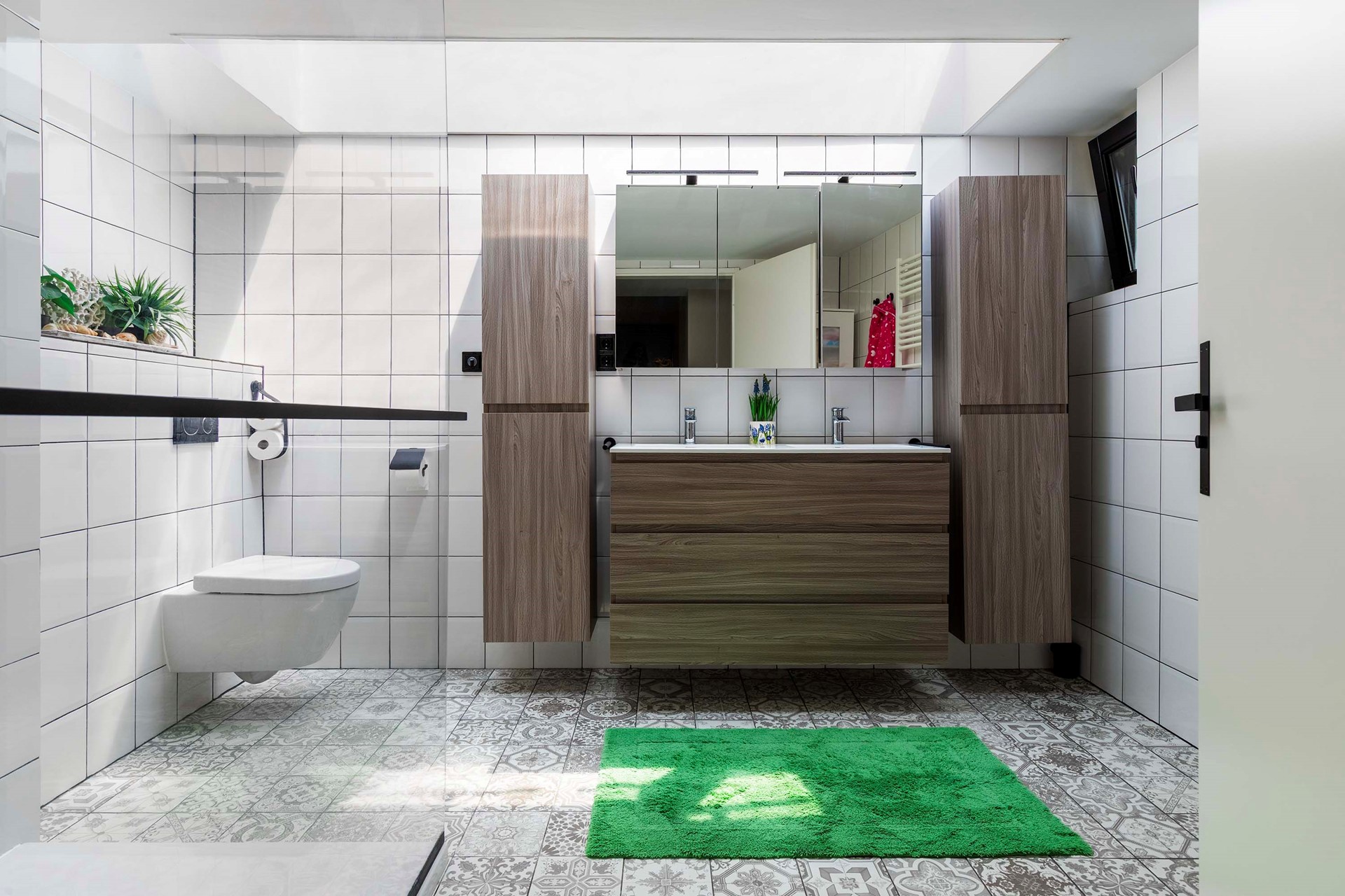 De moderne badkamer is ingedeeld met een riante inloopdouche, een dubbel wastafelmeubel, toilet en designradiator. De lichtkoepel met zonwering zorgt voor een aangename lichtinval. De gehele verdieping is voorzien van een stijlvolle PVC vloer.