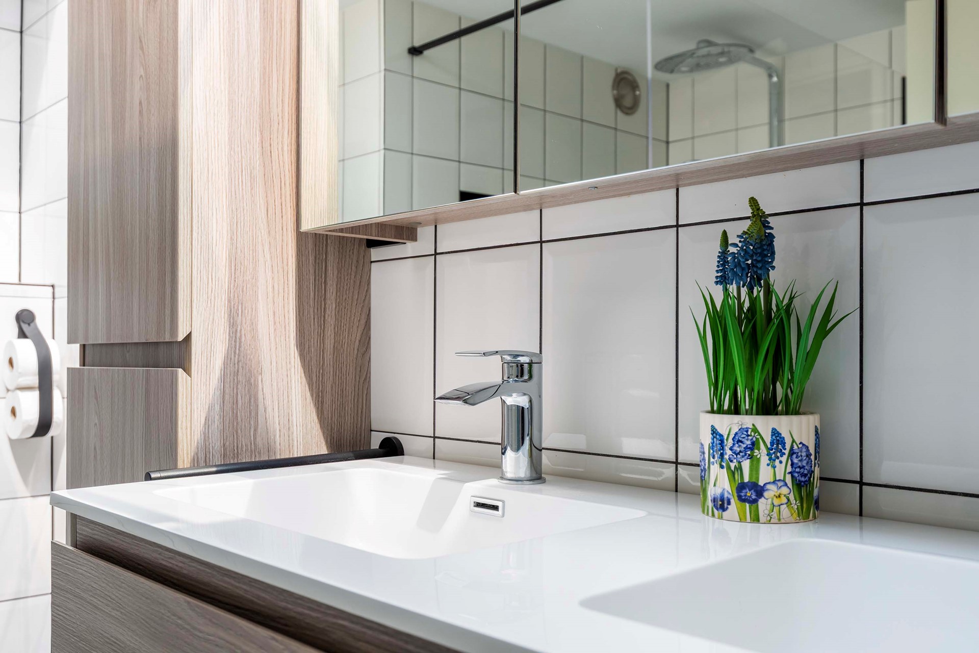 De badkamer is uitgerust met een douchecabine, toilet en wastafelmeubel. In de technische ruimte vindt u een tweede aansluiting voor was- en droogapparatuur, een spoelbak, de zonneboiler (Agpo) en de CV-ketel (Ferroli, 2017).