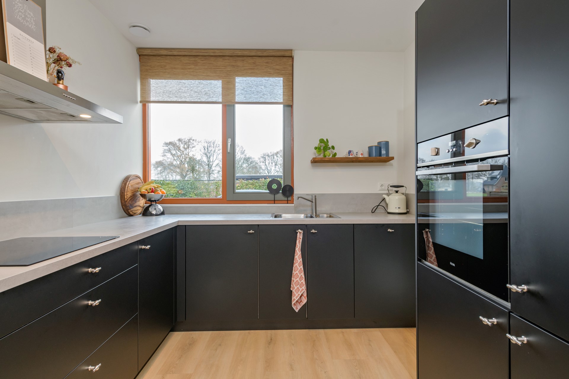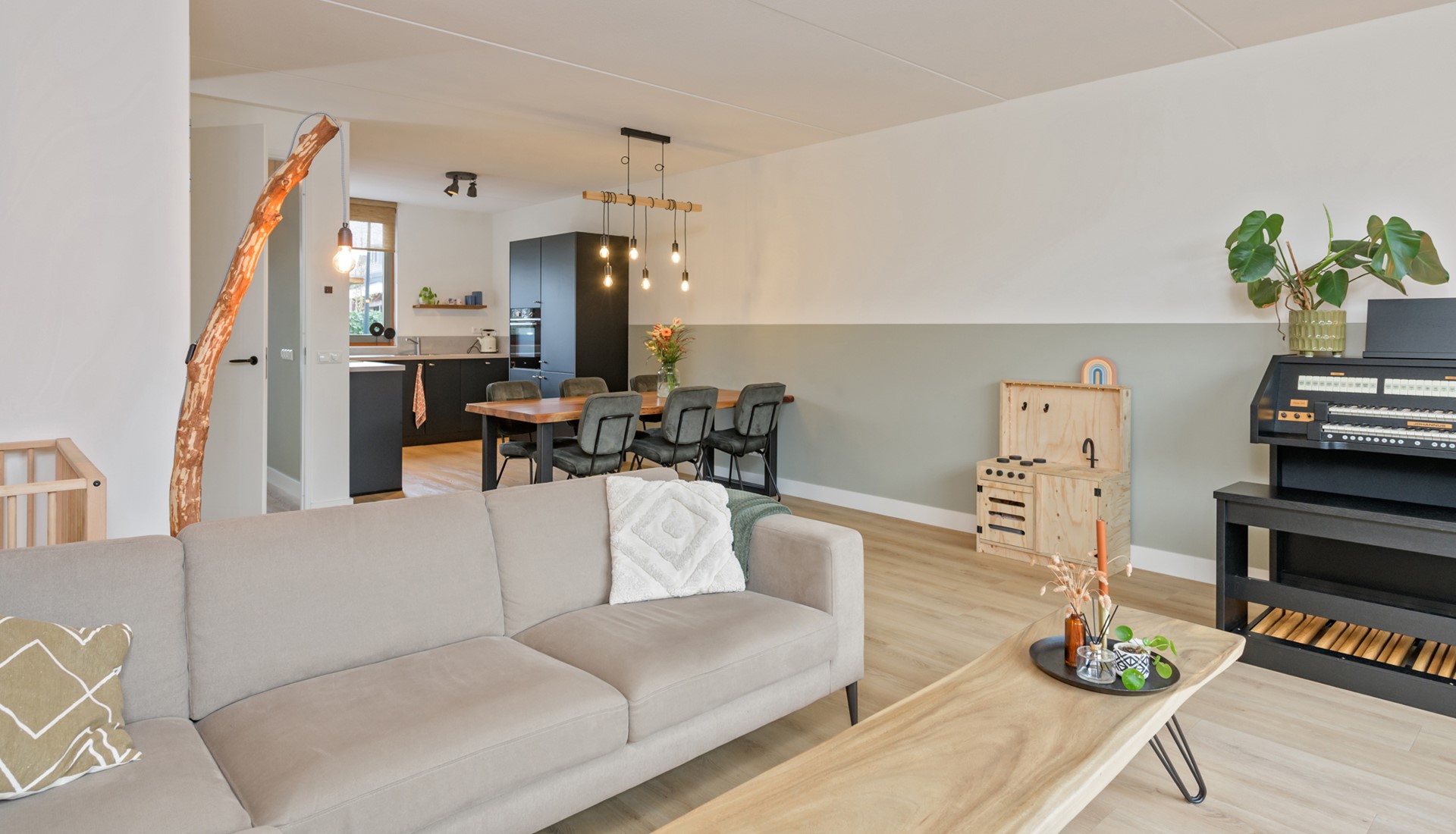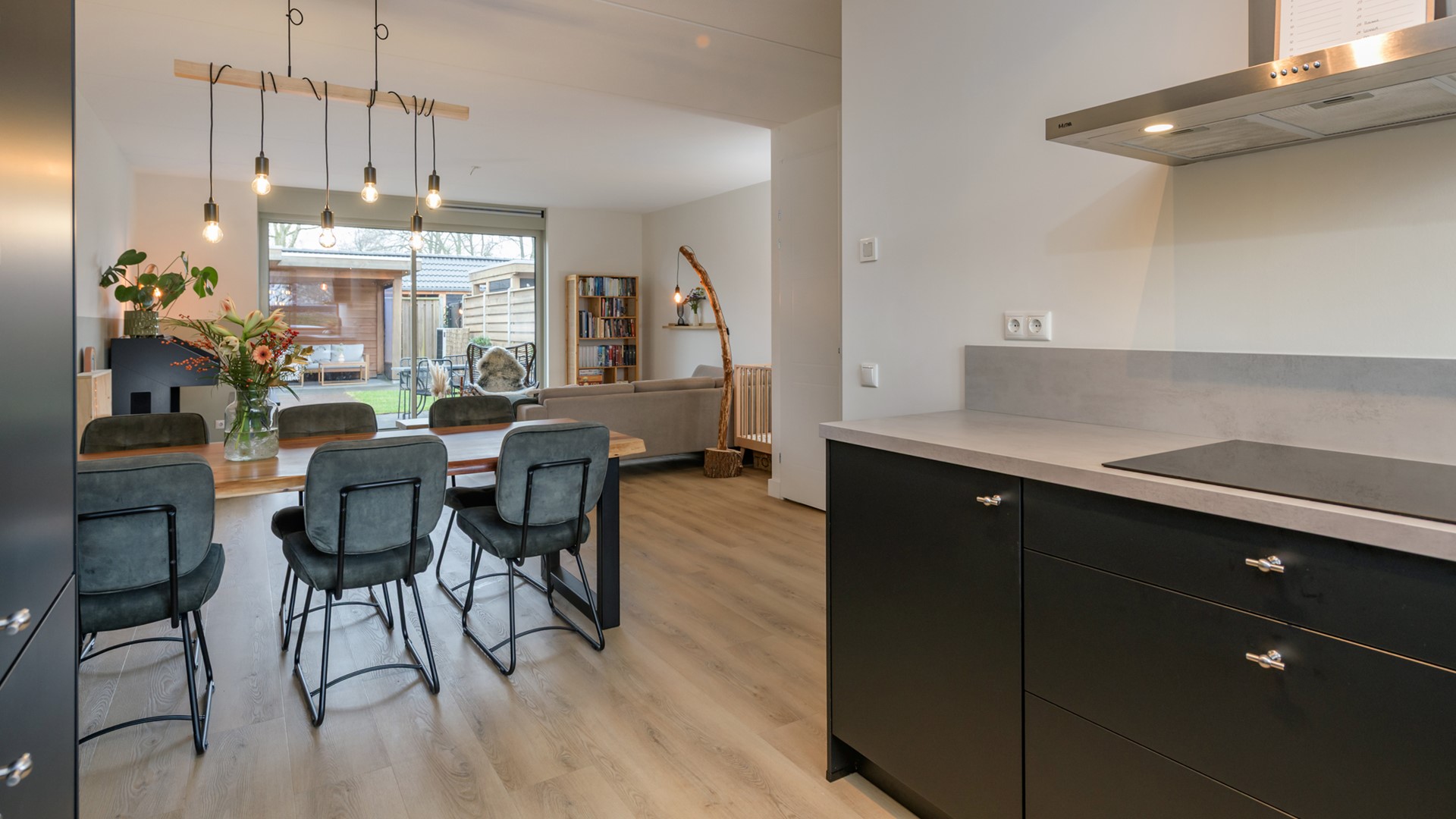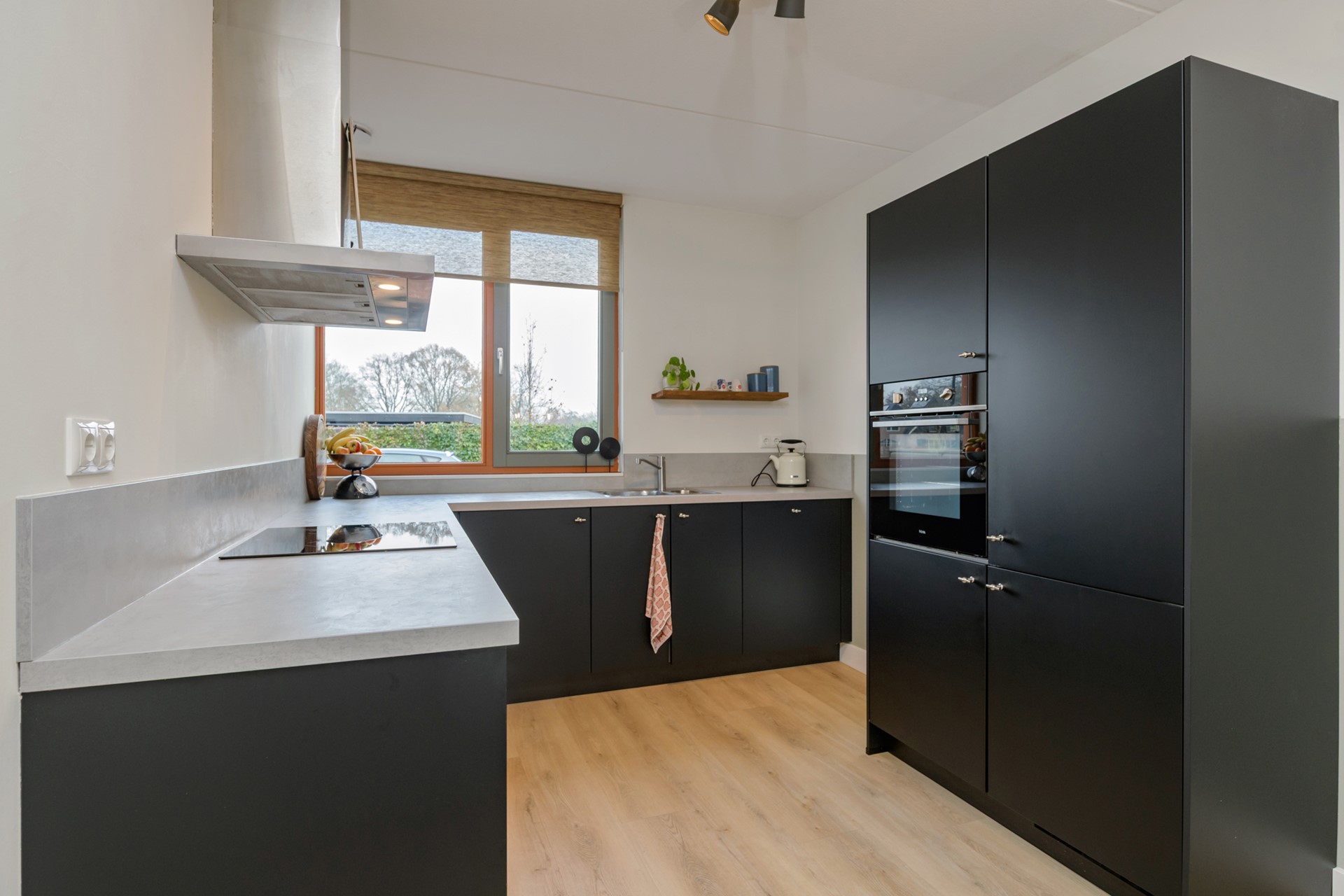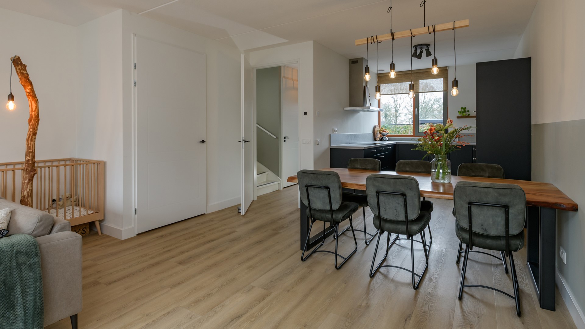 Entree/hal, meterkast en toilet met fonteintje. Binnenkomst in de woonkamer waar de schuifpui aan de achterzijde veel licht geeft en binnen met buiten verbindt. Er is een praktische trapkast aanwezig waar tevens de warmtepomp staat opgesteld. De keuken bevindt zich aan de voorzijde van de woning, is modern uitgevoerd en voorzien van diverse inbouwapparatuur waaronder een 4-pits inductiekookplaat met afzuigkap, vaatwasser, oven en koelkast met vriesvak. Op de begane grond ligt een gelijmde PVC vloer met eronder vloerverwarming.