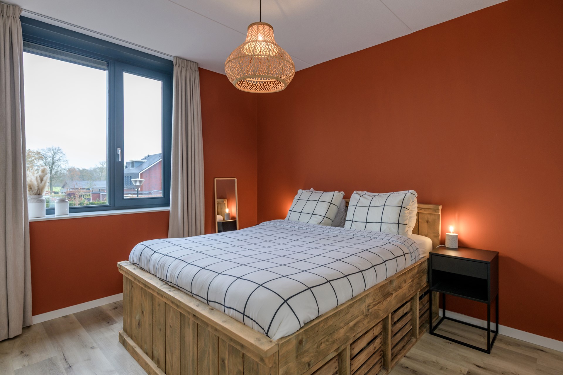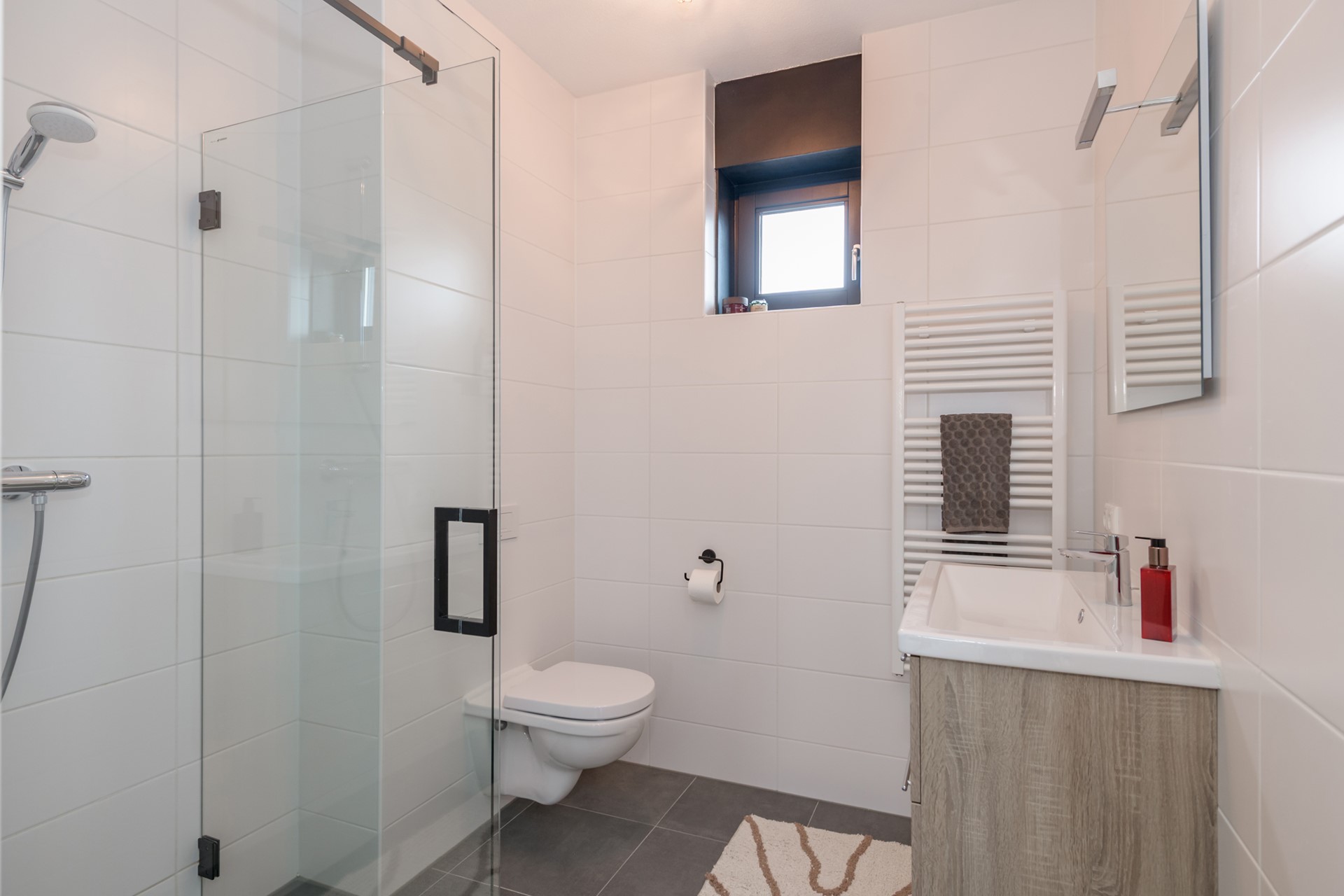Overloop, drie slaapkamers en een badkamer. Alle drie de slaapkamers zijn voorzien van horren en de verzorgde badkamer is uitgerust met een inloopdouche, wastafelmeubel, toilet en designradiator. Ook deze verdieping beschikt over vloerverwarming met een klik PVC vloer.