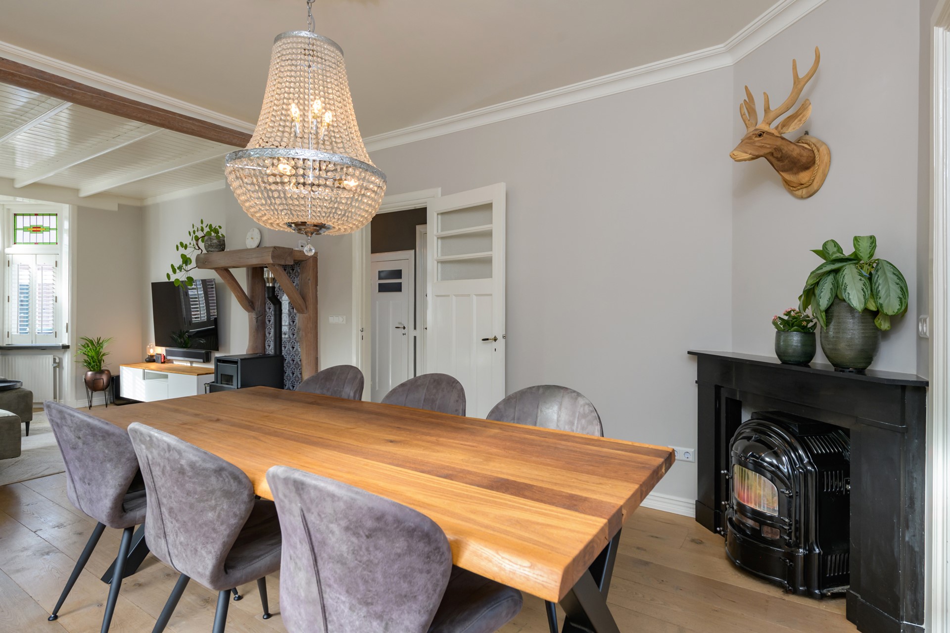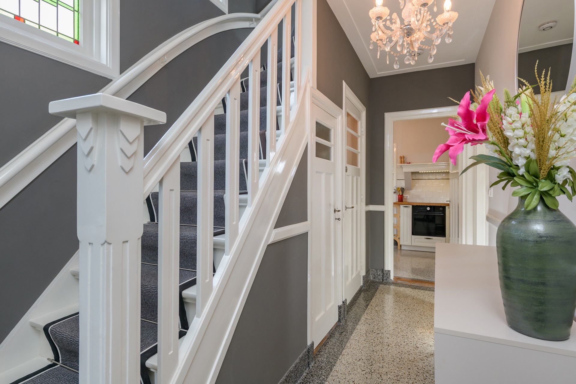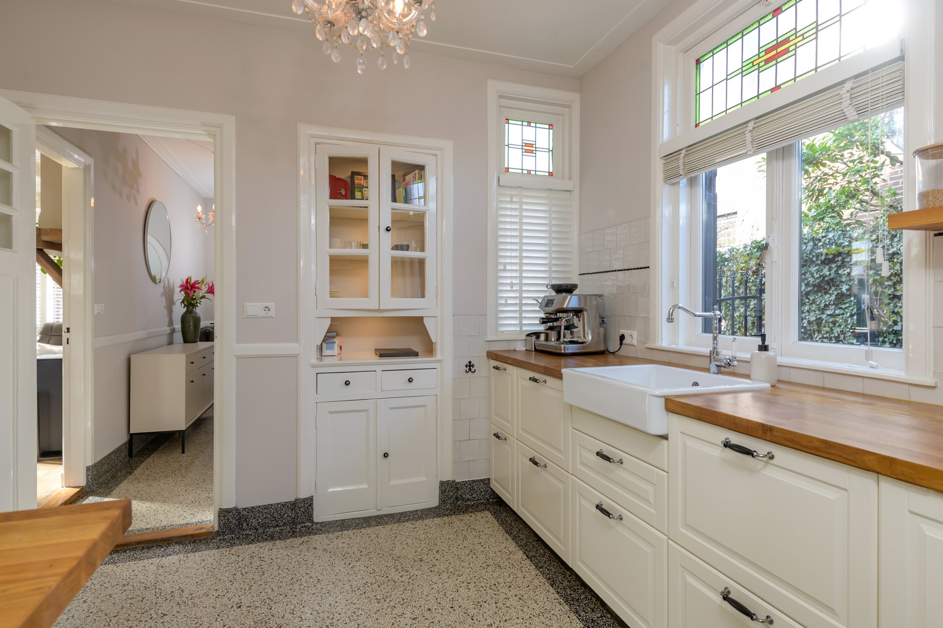 Entree/hal met granito vloer, kelder met vernieuwde meterkast en toilet met fonteintje. Binnenkomst in de ruime woonkamer met erker, sfeervolle kachel en doorloop naar de aangebouwde serre met vloerverwarming. De originele en suite deuren zijn geplaatst tussen de woonkamer en de serre. Vanaf de serre is middels openslaande deuren het terras te bereiken. De keuken is geplaatst in een dichte ruimte en beschikt over een originele inbouwkast. Daarnaast is er inbouwapparatuur aanwezig waaronder een 4-pits inductiekookplaat met afzuigkap, een stoomoven en een vaatwasser. De koelvriescombinatie (ter overname), de aansluiting voor de was- en droogapparatuur en de opstelling C.V. ketel (Intergas, 2017) bevinden zich in de aangrenzende bijkeuken. De keuken en de bijkeuken zijn beiden nieuw geplaatst in 2020.