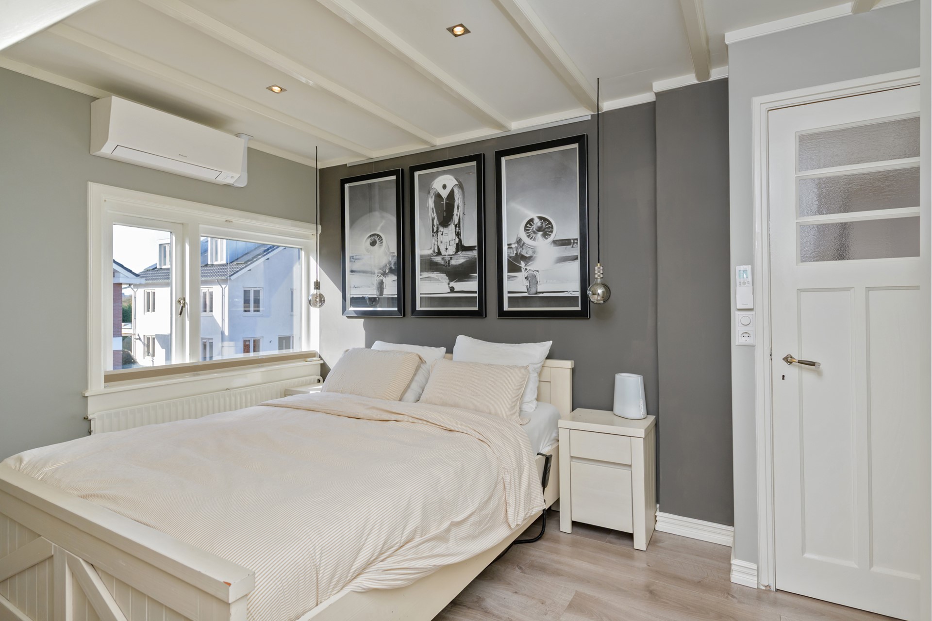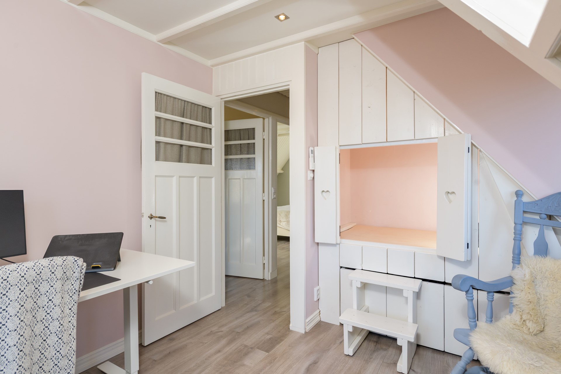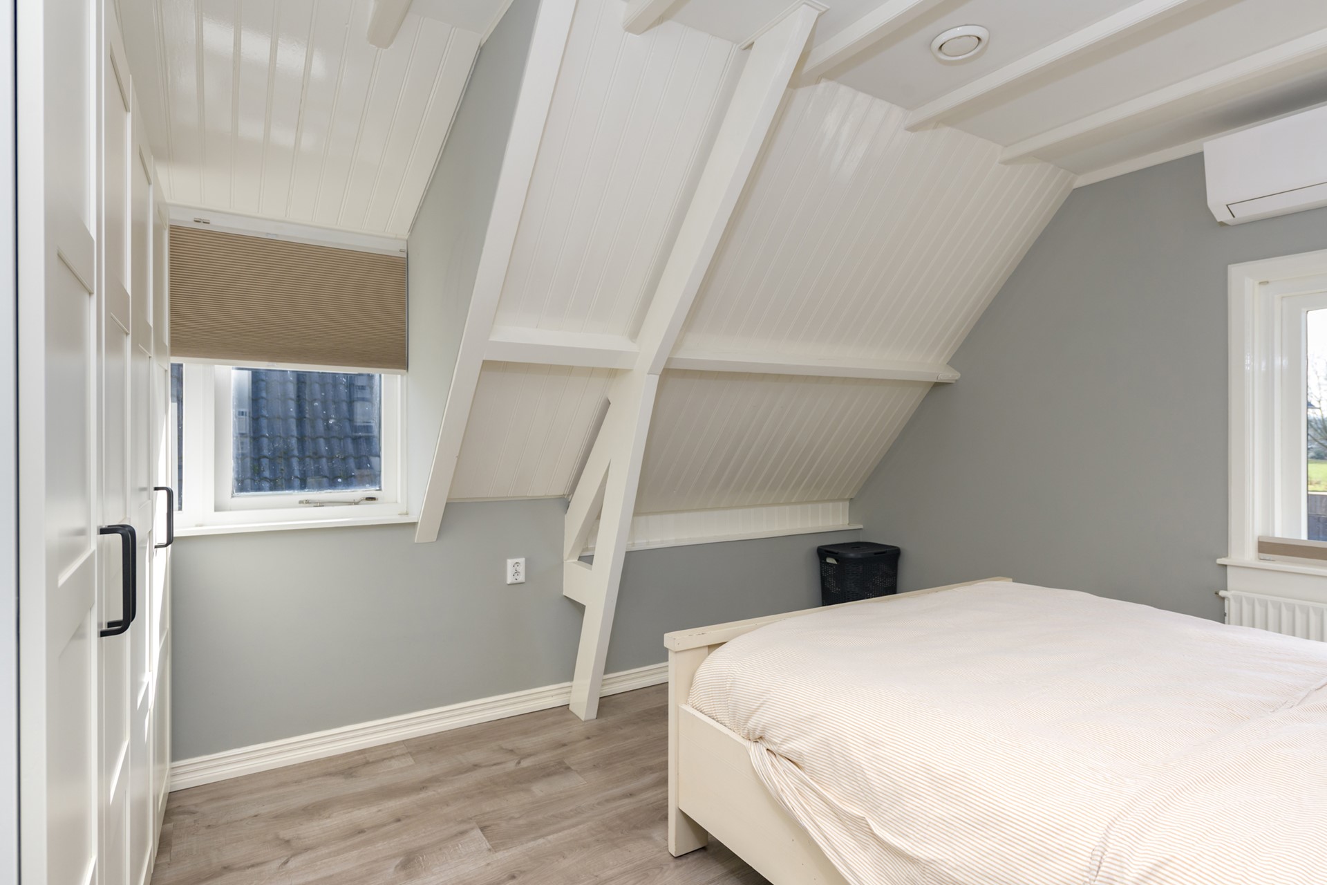 Overloop, drie ruime, gelijkwaardige slaapkamers en een badkamer. De badkamer is stijlvol uitgevoerd en beschikt over een inloopdouche, toilet en een wastafelmeubel. Alle slaapkamers beschikken over airco en de achterste twee slaapkamers hebben toegang tot het dakterras. Eén van de slaapkamers beschikt over een bedstee.