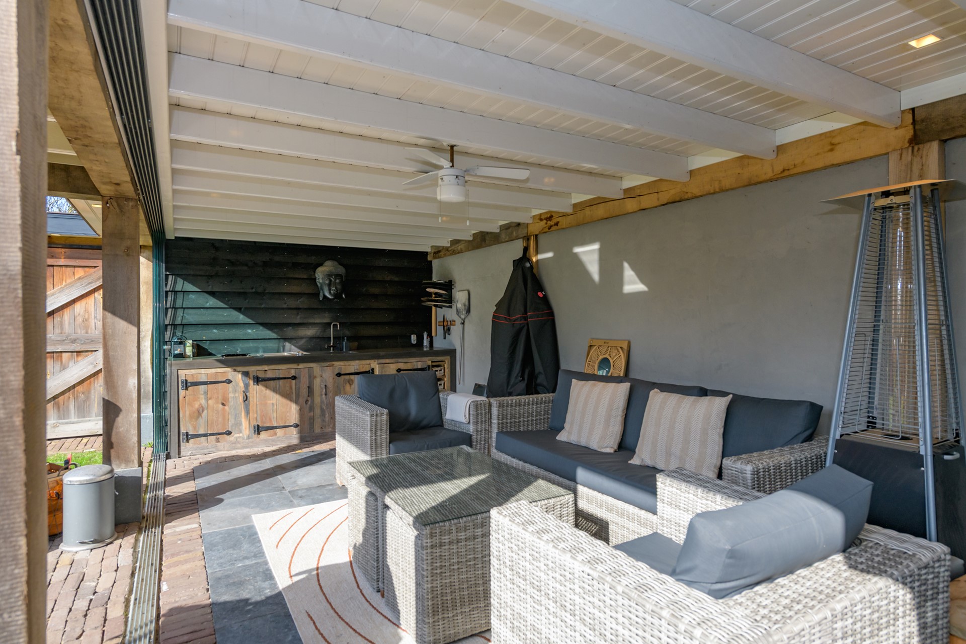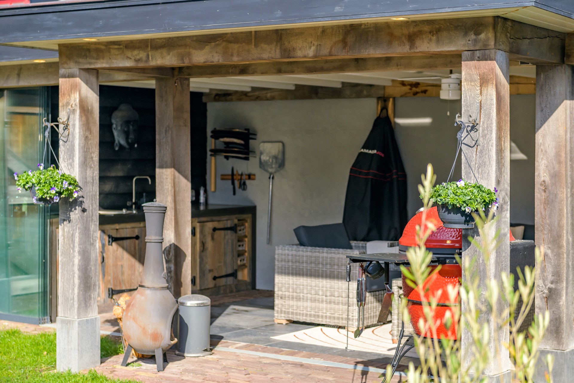 De tuin biedt veel ruimte en privacy. Hobbyisten kunnen hier hun hart ophalen door de aanwezigheid van een ruime, in spouw gebouwde, garage met een verwarmd souterrain en een zolderverdieping. Een ideale ruimte voor het uitoefenen van een hobby, werken aan huis of als opslag. Door de aanwezigheid van een volledig afsluitbare veranda kun je het gehele jaar door genieten van het buitenleven. Naast de veranda zijn bergingen aanwezig voor het opbergen van het tuingereedschap. Op de oprit met carport is ruimte voor het parkeren van meerdere auto’s.